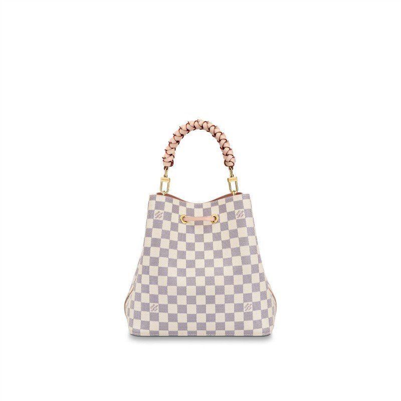 For Summer 2020 the NéoNoé bucket bag in Damier Azur canvas features a braided-leather top handle. The hand-painted edge-dyeing of the top-handle leather is a gauge of the House’s commitment to craftsmanship. It can be hand-carried or worn over the shoulder and cross-body with its bicolor removable leather strap.