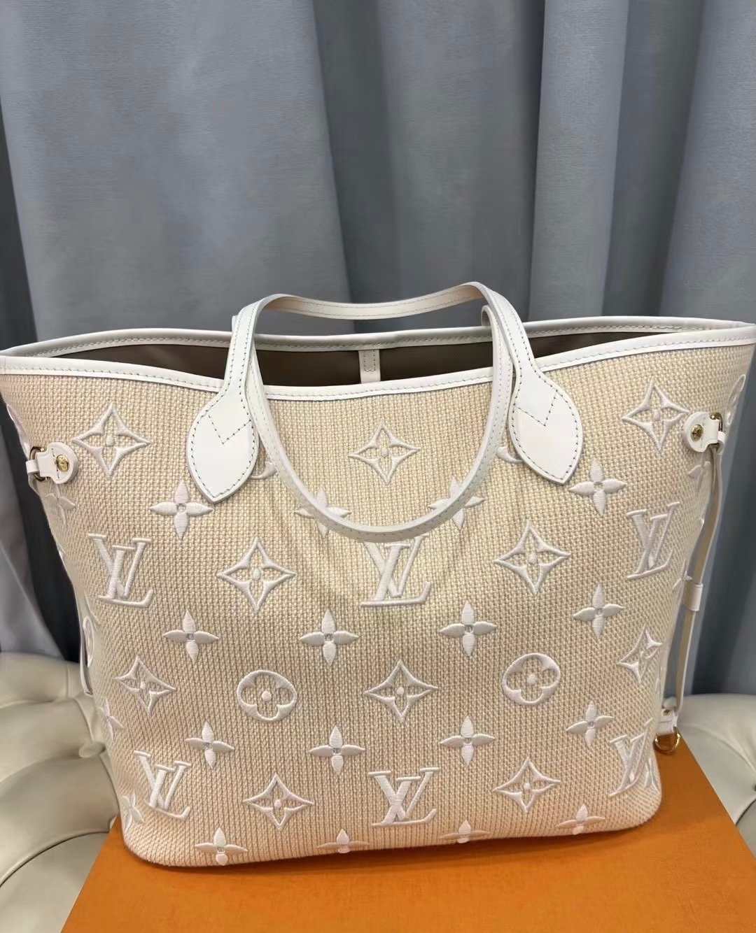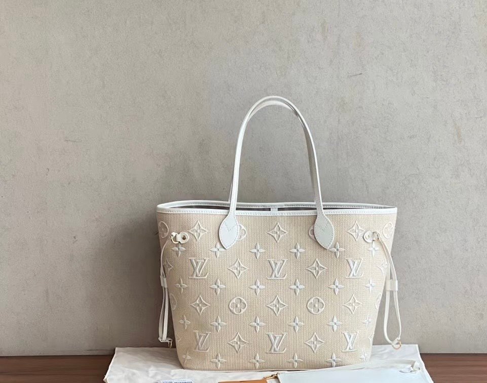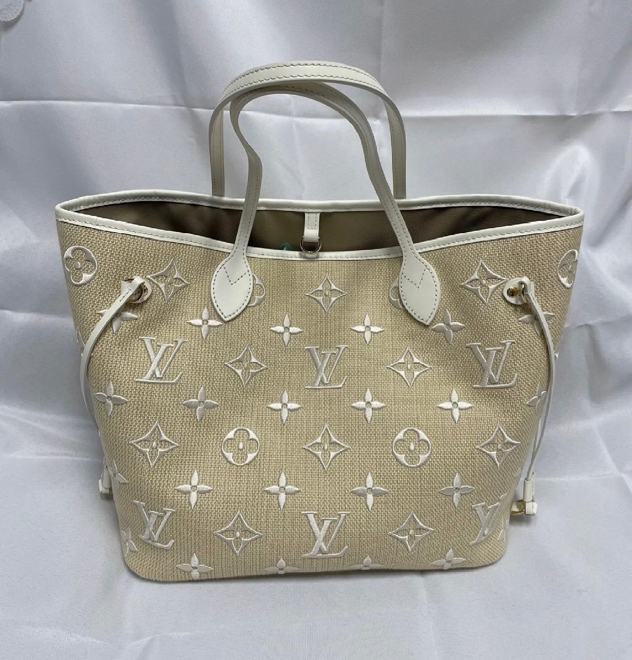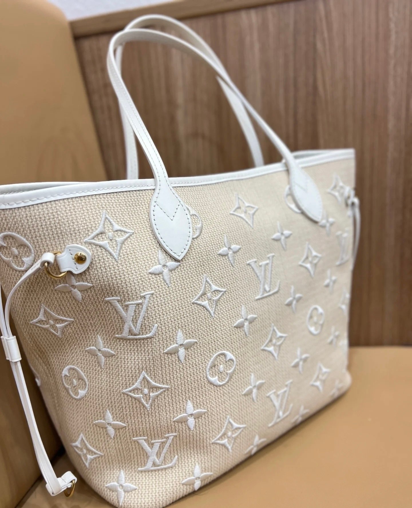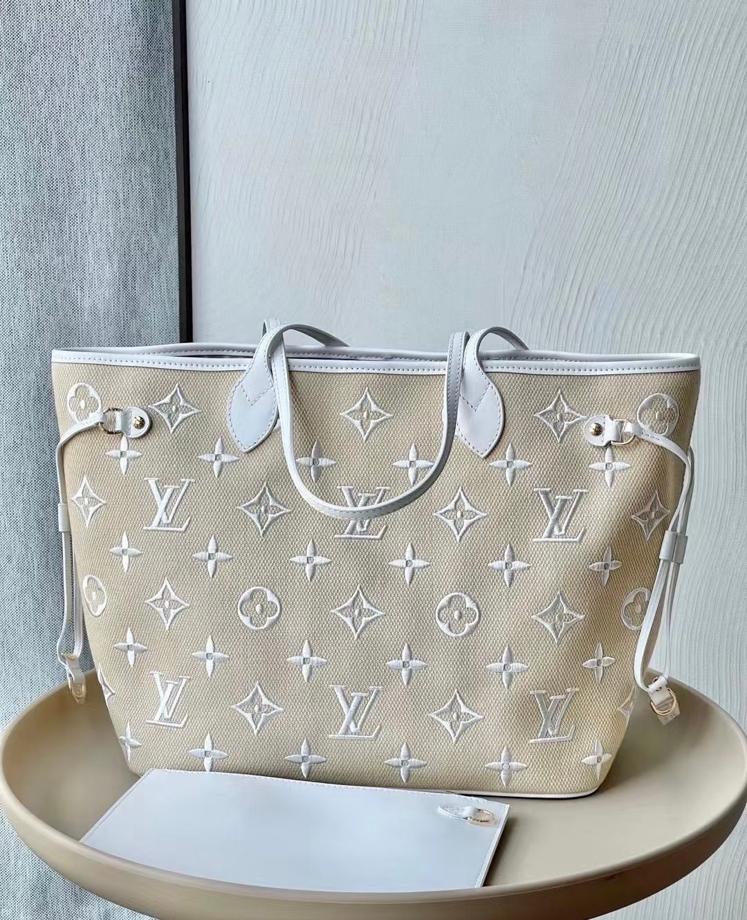 The season’s Neverfull MM tote captures the spirit of carefree seaside vacations. Part of the new By the Pool capsule it is made from supple raffia-like cotton material embellished with a crafted summer-ready version of the Monogram pattern. Easy to care for easy to carry this roomy Neverfull is the perfect daily companion for a relaxed sunny holiday.