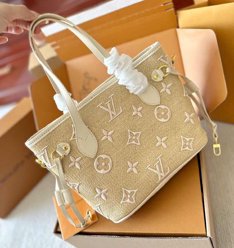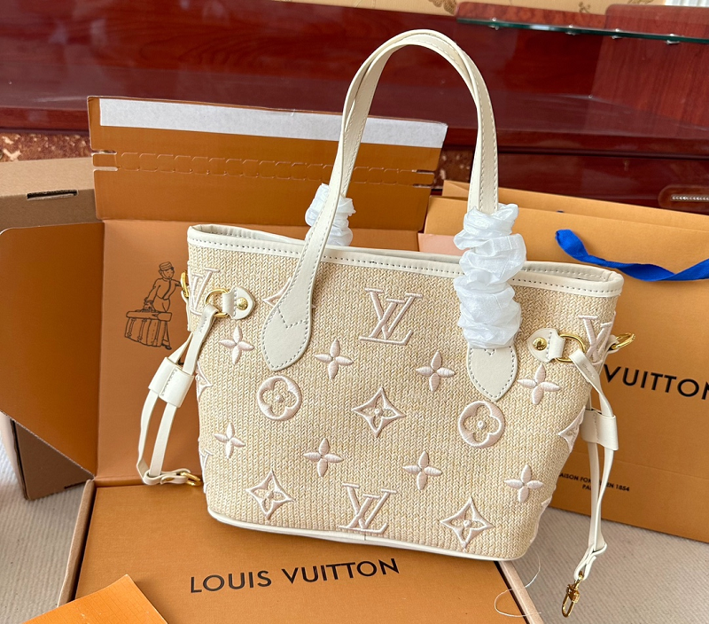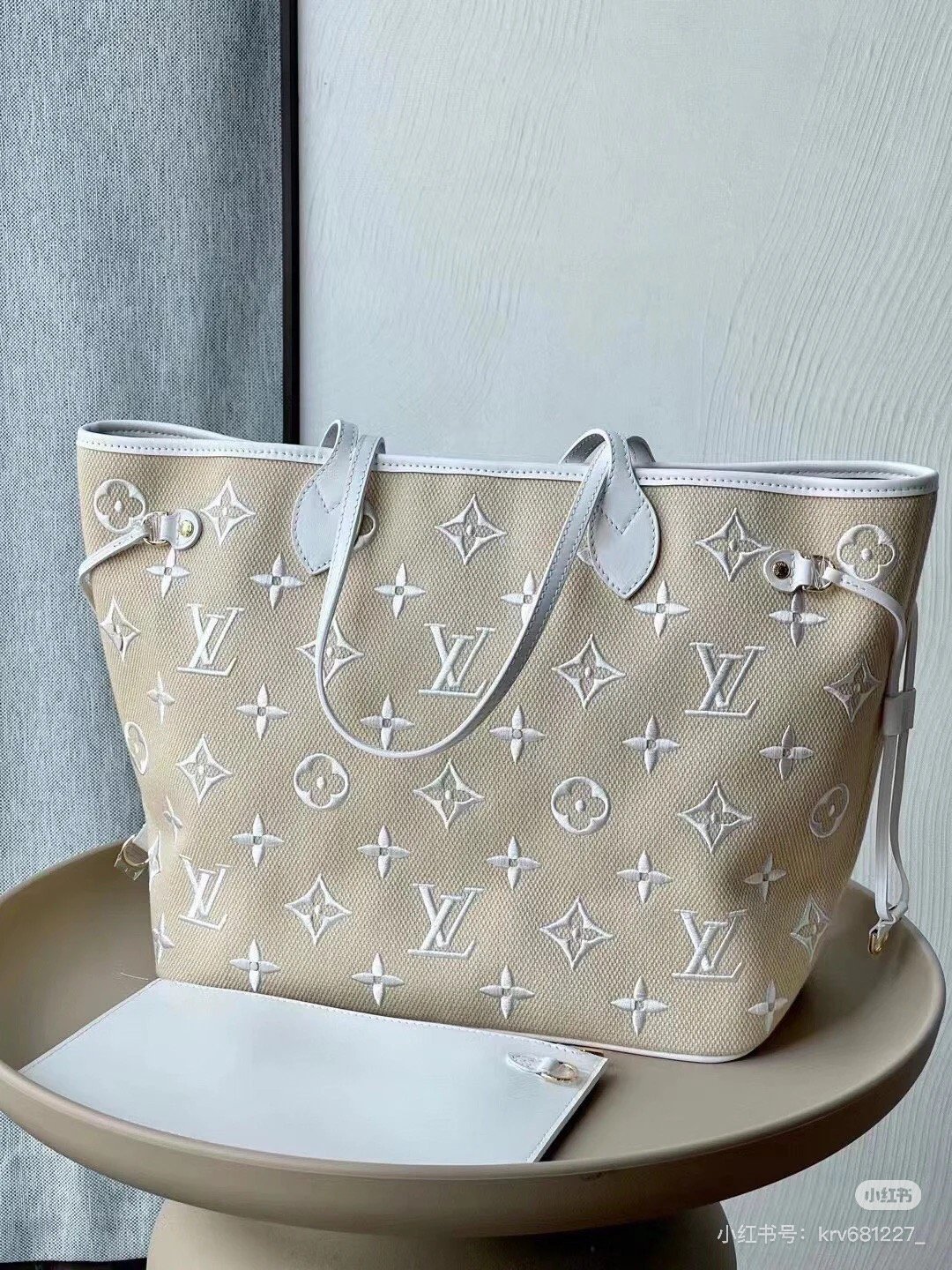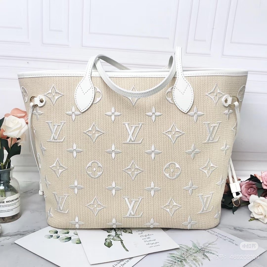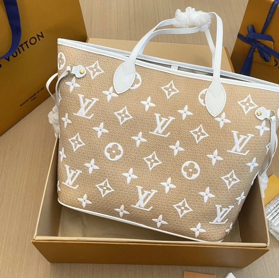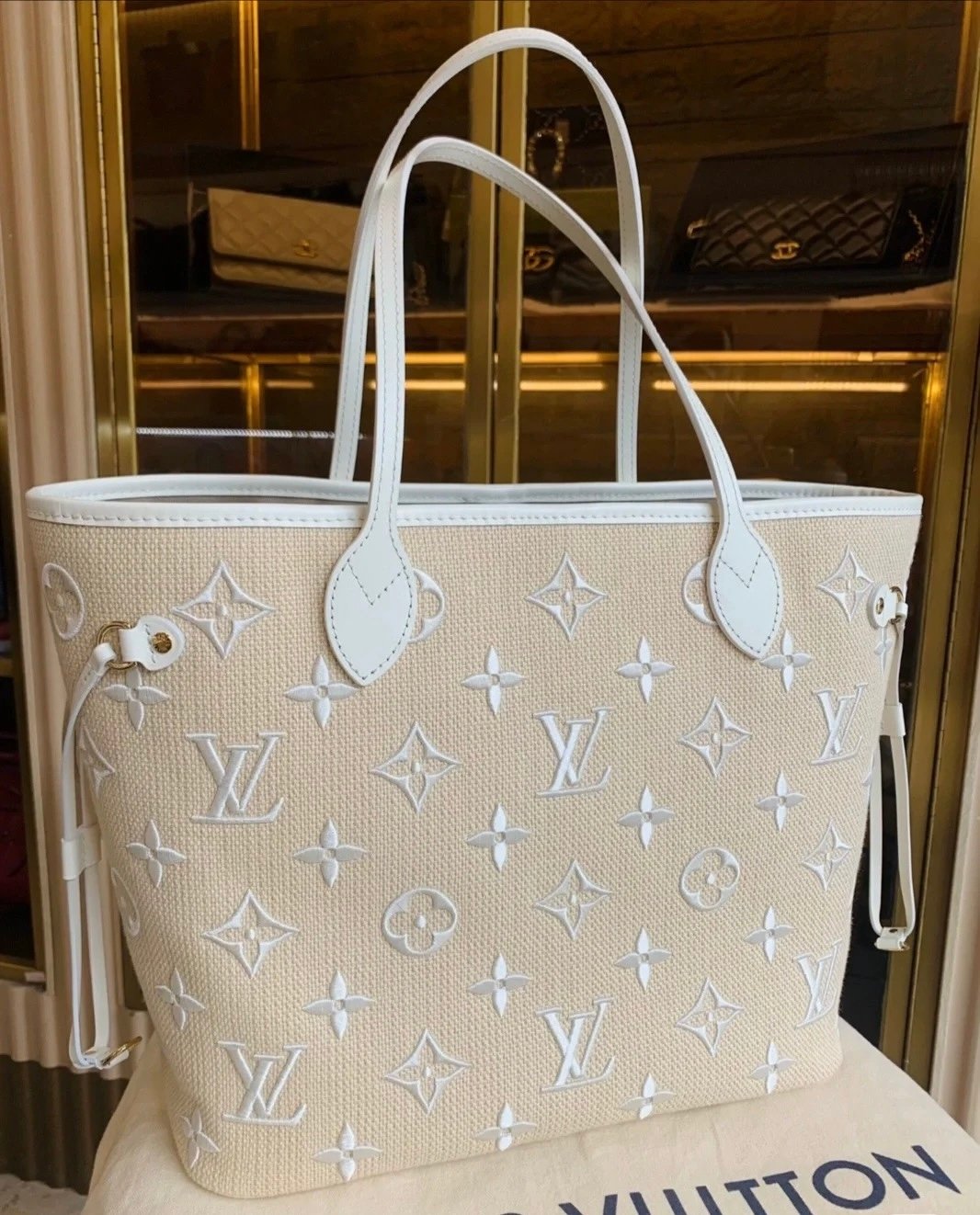 The season’s Neverfull MM tote captures the spirit of carefree seaside vacations. Part of the new By the Pool capsule it is made from supple raffia-like cotton material embellished with a crafted summer-ready version of the Monogram pattern. Easy to care for easy to carry this roomy Neverfull is the perfect daily companion for a relaxed sunny holiday.