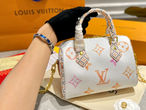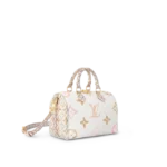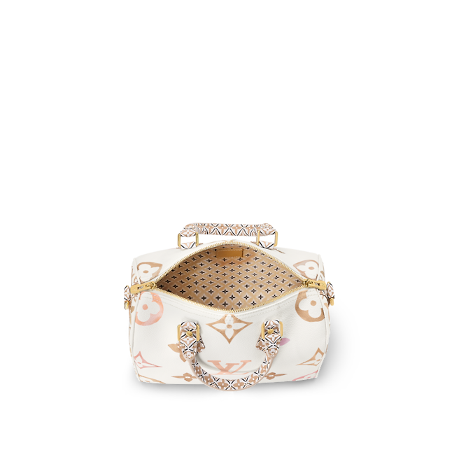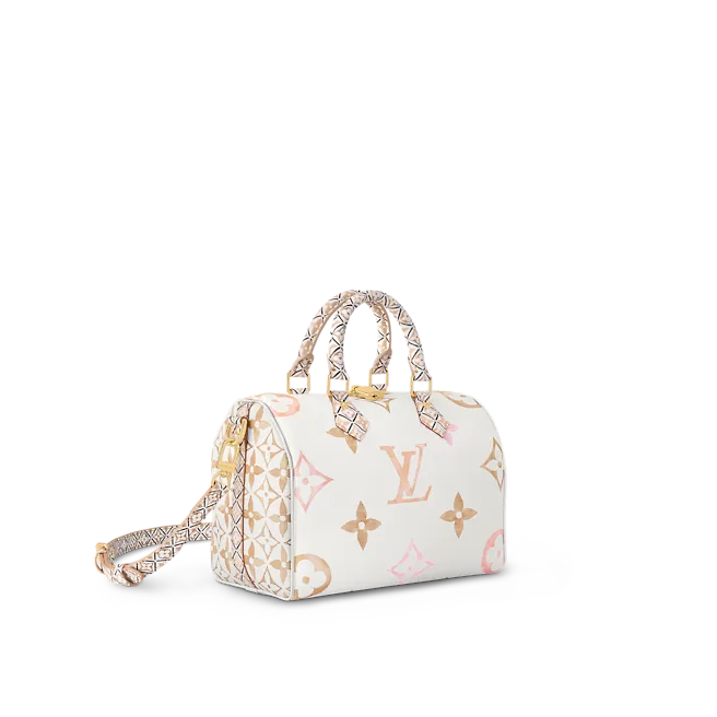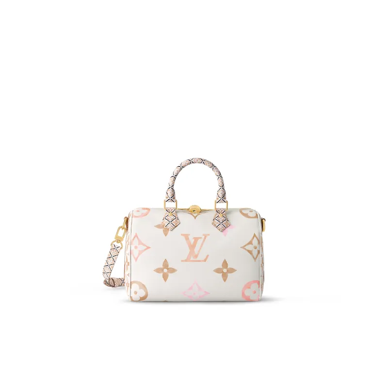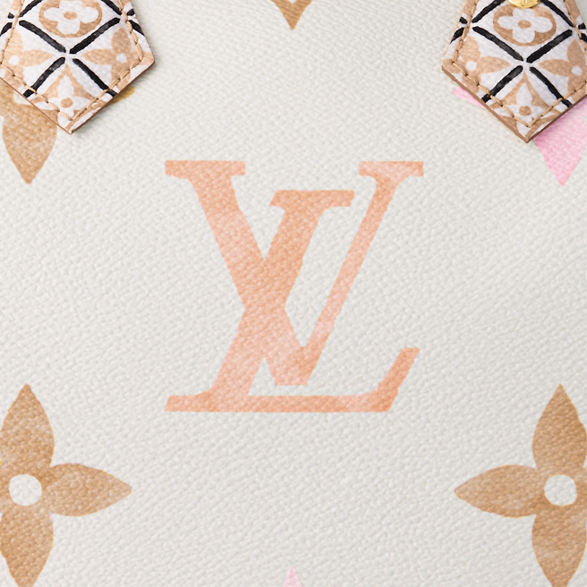 Crafted from coated canvas the Speedy Bandoulière 25 handbag is adorned with a Giant Monogram pattern in nuances of pastel. The complex motifs on the trim handles handle mounts and lining in the same colorway as the rest of the bag are inspired by the tiles at the House’s workshops in Asnières just outside Paris.