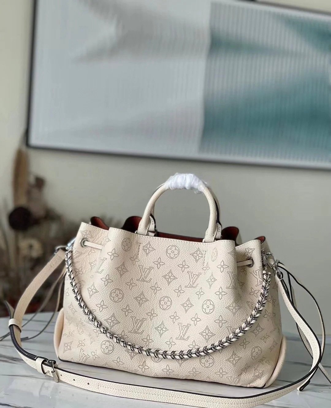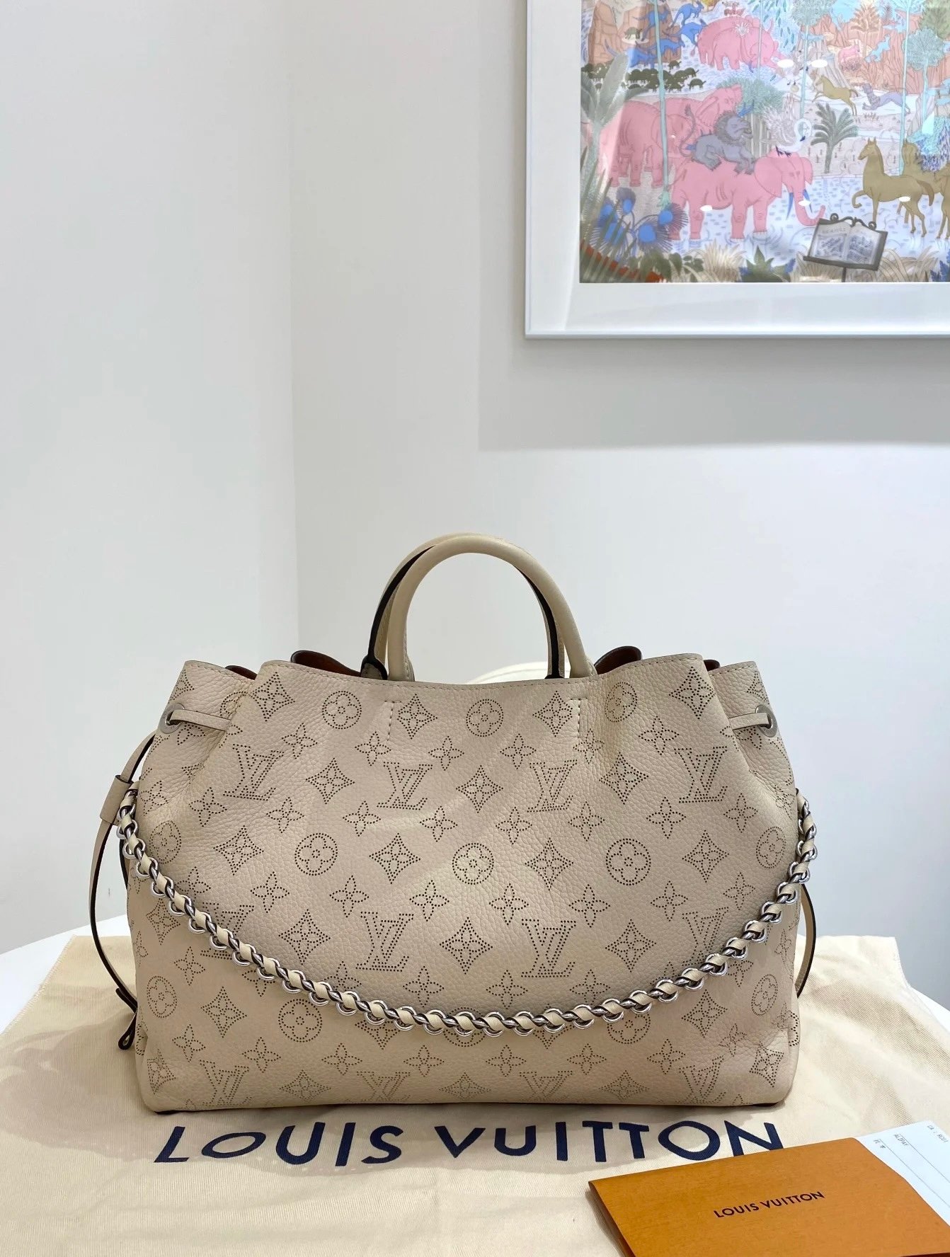 A cross between a bucket bag and carryall the roomy Bella Tote bag is fashioned from Mahina perforated calfskin leather. Here the perforations are in a slightly darker shade to emphasize the Monogram pattern. Spacious and lightweight with two separate inside compartments it’s perfect for everyday use. 32 x 23 x 13 cm