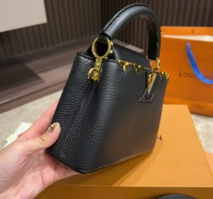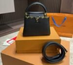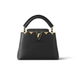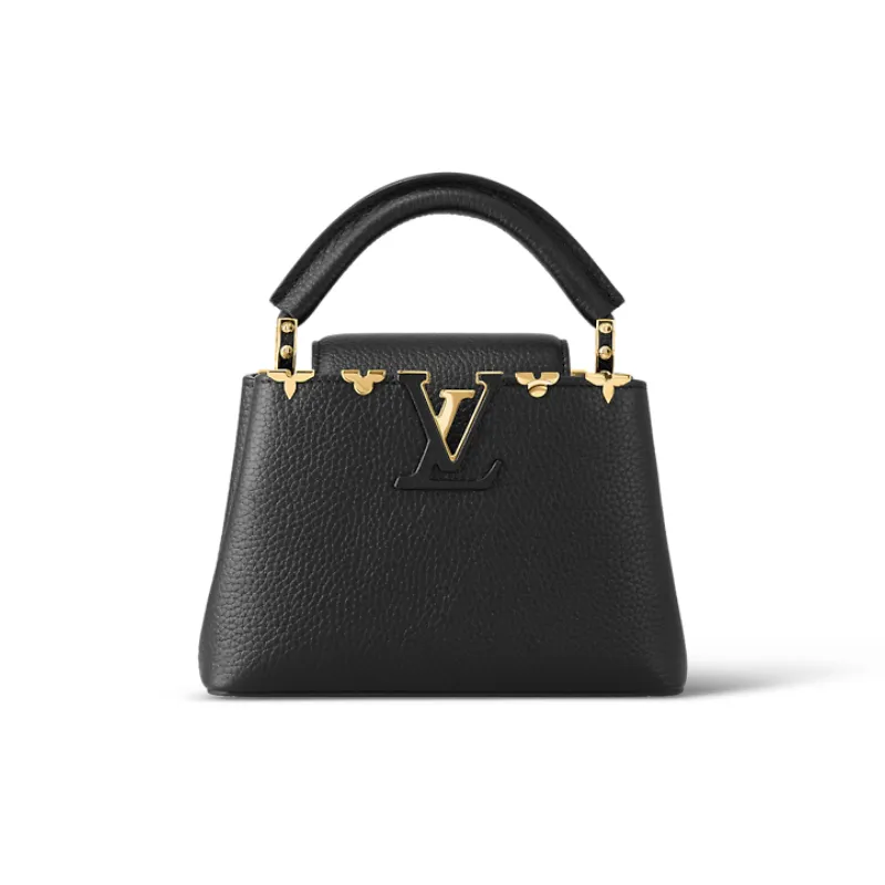 Crafted of dark-dyed black taurillon leather this Capucines mini tote is adorned with a gold-tone floral “crown” that is hand-secured to the leather. The lovely size and delicate floral embellishments lend a refined femininity while the stylish detachable wide shoulder strap and leather top handles offer a variety of carrying options.
