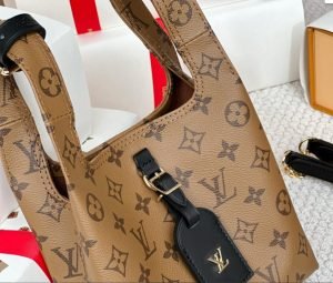 The Atlantis BB tote is crafted in Monogram Reverse canvas with dark cowhide trim and includes a LV name tag and removable shoulder strap. The fashion-forward shape is inspired by shopping bags and its soft construction hugs the body. Adjustable and removable shoulder strap for cross-body wear.