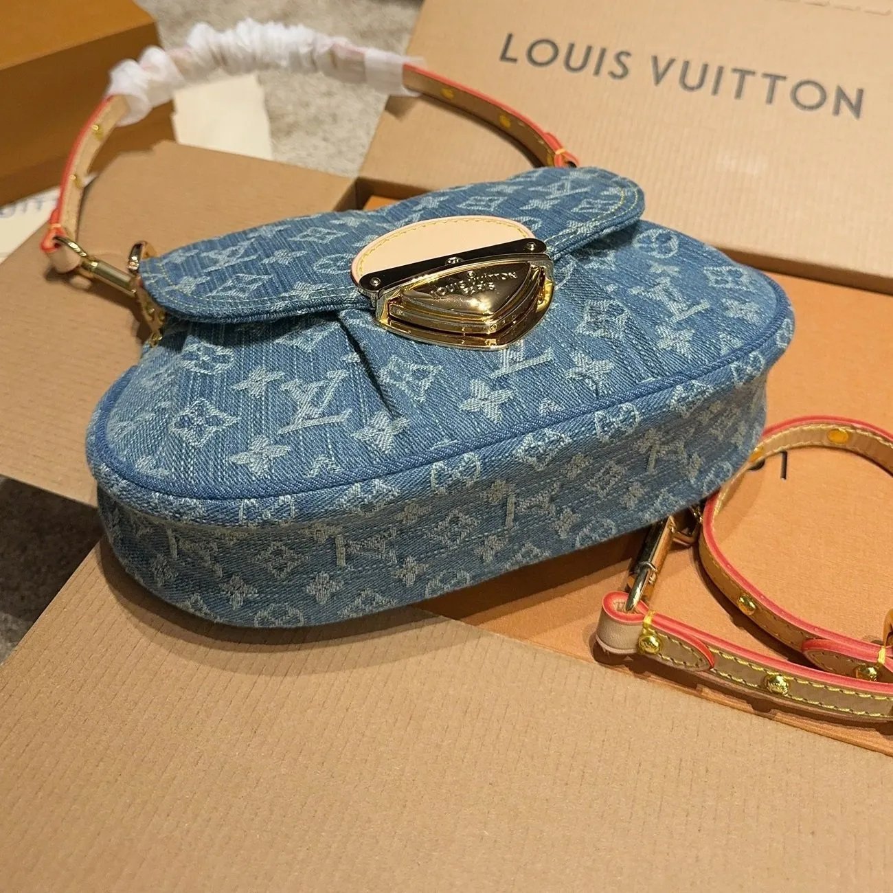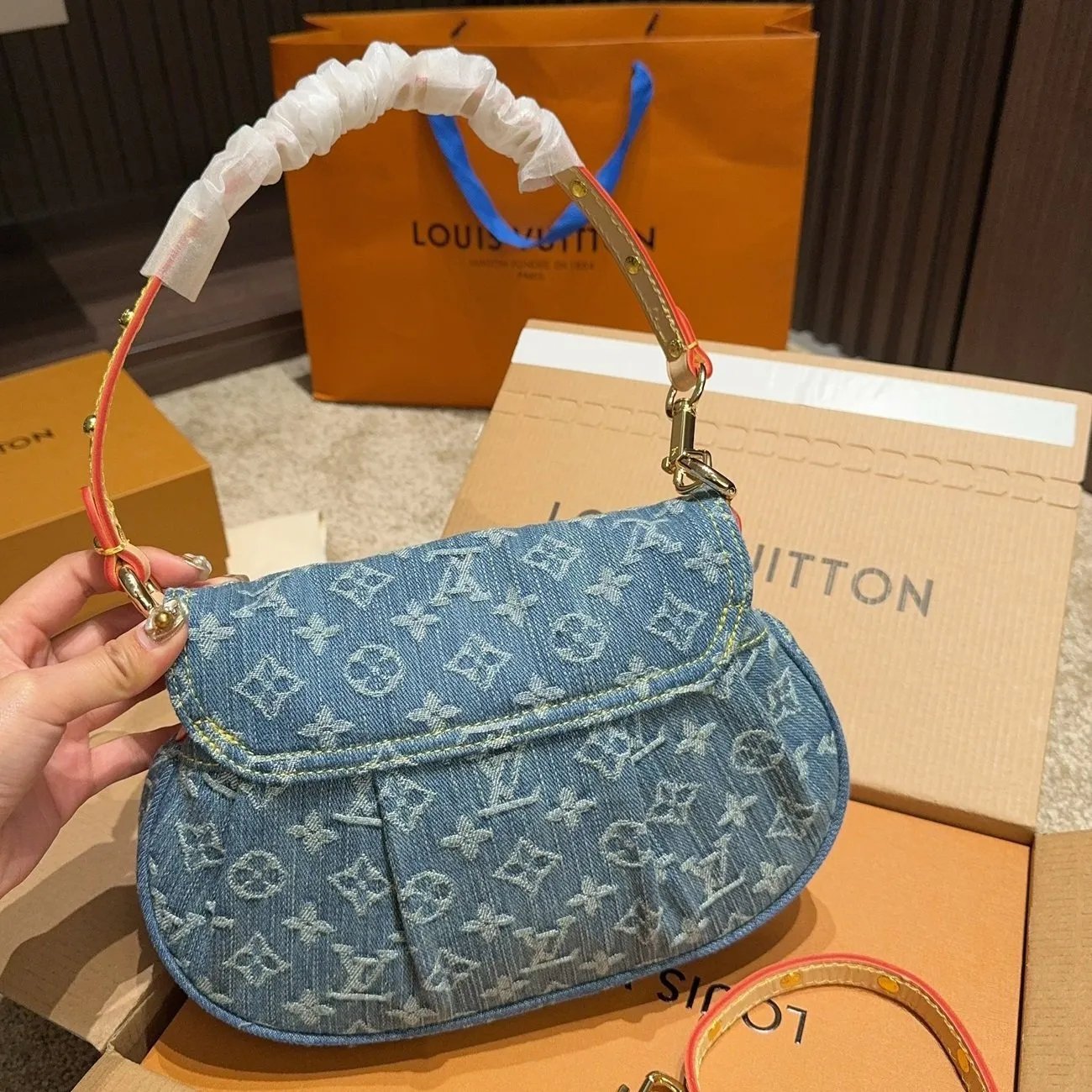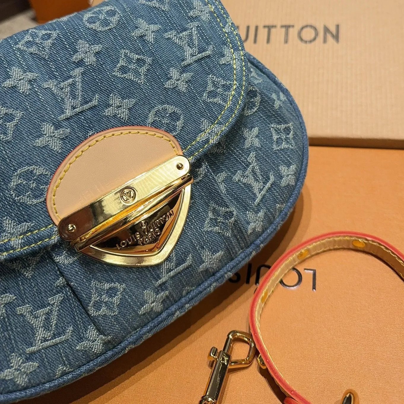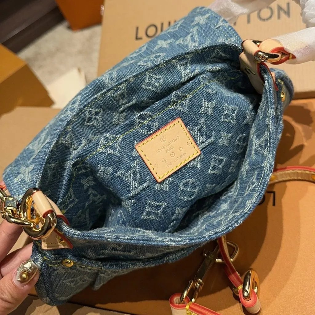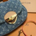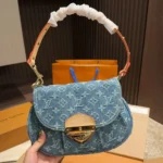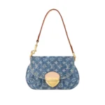 The Sunset handbag is made from Monogram Denim canvas and is adorned with the House’s tuck lock. Creating Monogram Denim is a multi-step process. First the Monogram pattern is woven into the Global Organic Textile Standard-certified cotton which is then bleached. Once assembled each bag is stonewashed to give it a unique aspect. The Sunset can also be styled for cross-body wear thanks to an extra extension strap included with the piece.