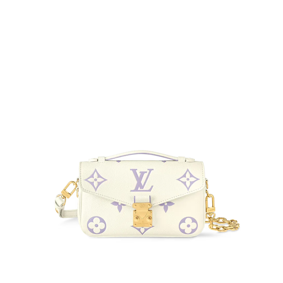 Part of the Milky Way capsule the two-color Monogram Empreinte leather of this Pochette Métis East West handbag features a luminous off-white base with the Monogram motif embossed and then printed on the leather in a muted pastel tone. The Pochette Métis has a leather handle a removable chain and a detachable strap for carry options.