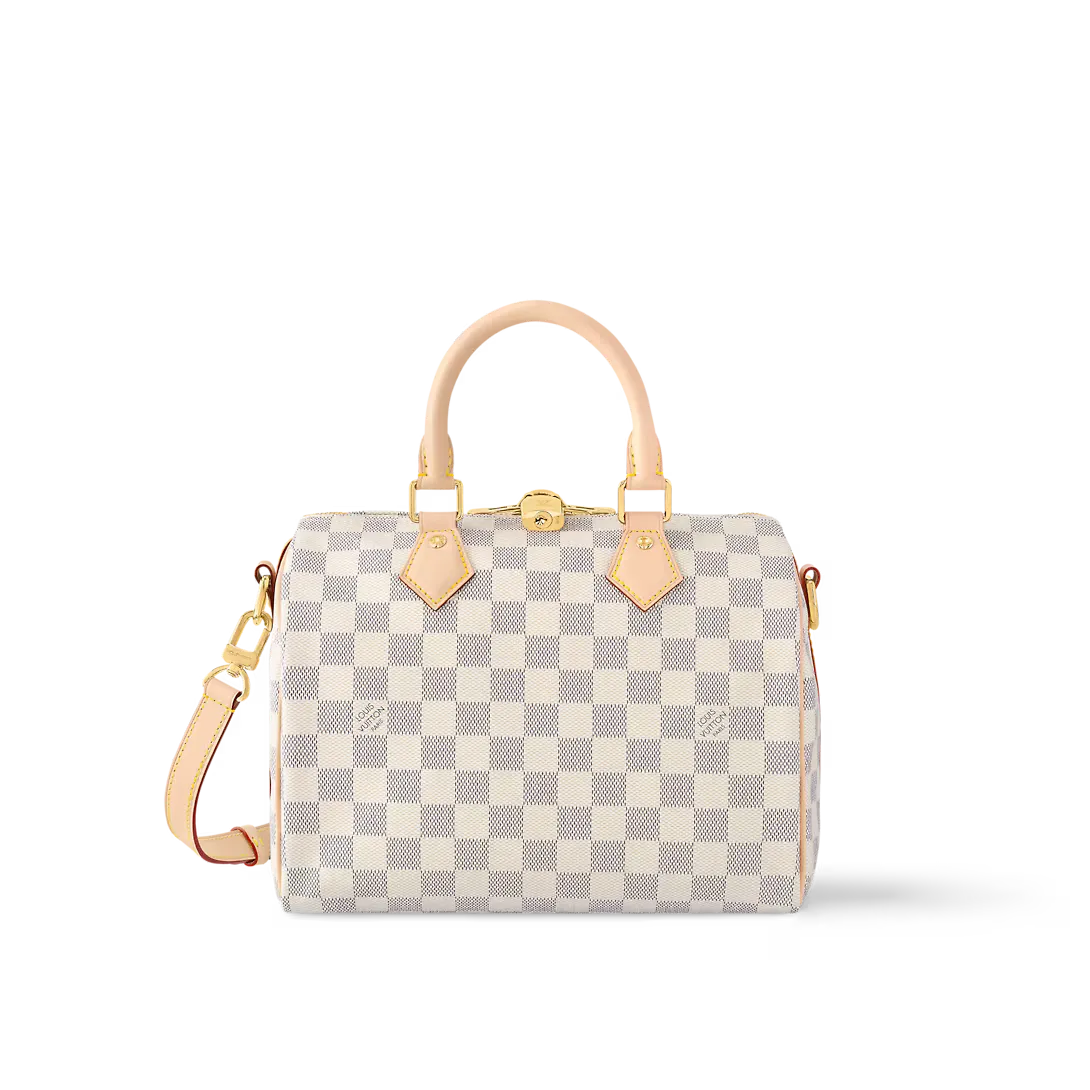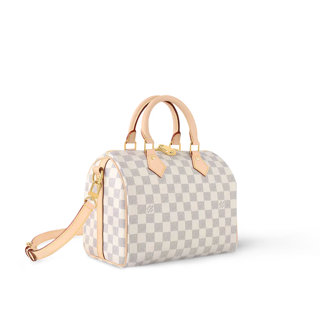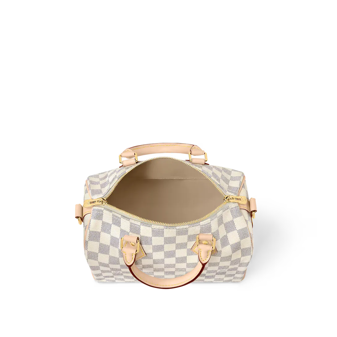 The Speedy Bandoulière 25 handbag in fresh Damier Azur canvas is an ideal choice for summer in the city. Originally created for travelers in the 1930s – the name refers to the era’s rapid transit – every feature of the Speedy’s design is iconic from its unmistakable shape to the rolled leather handles engraved padlock and detachable strap.