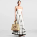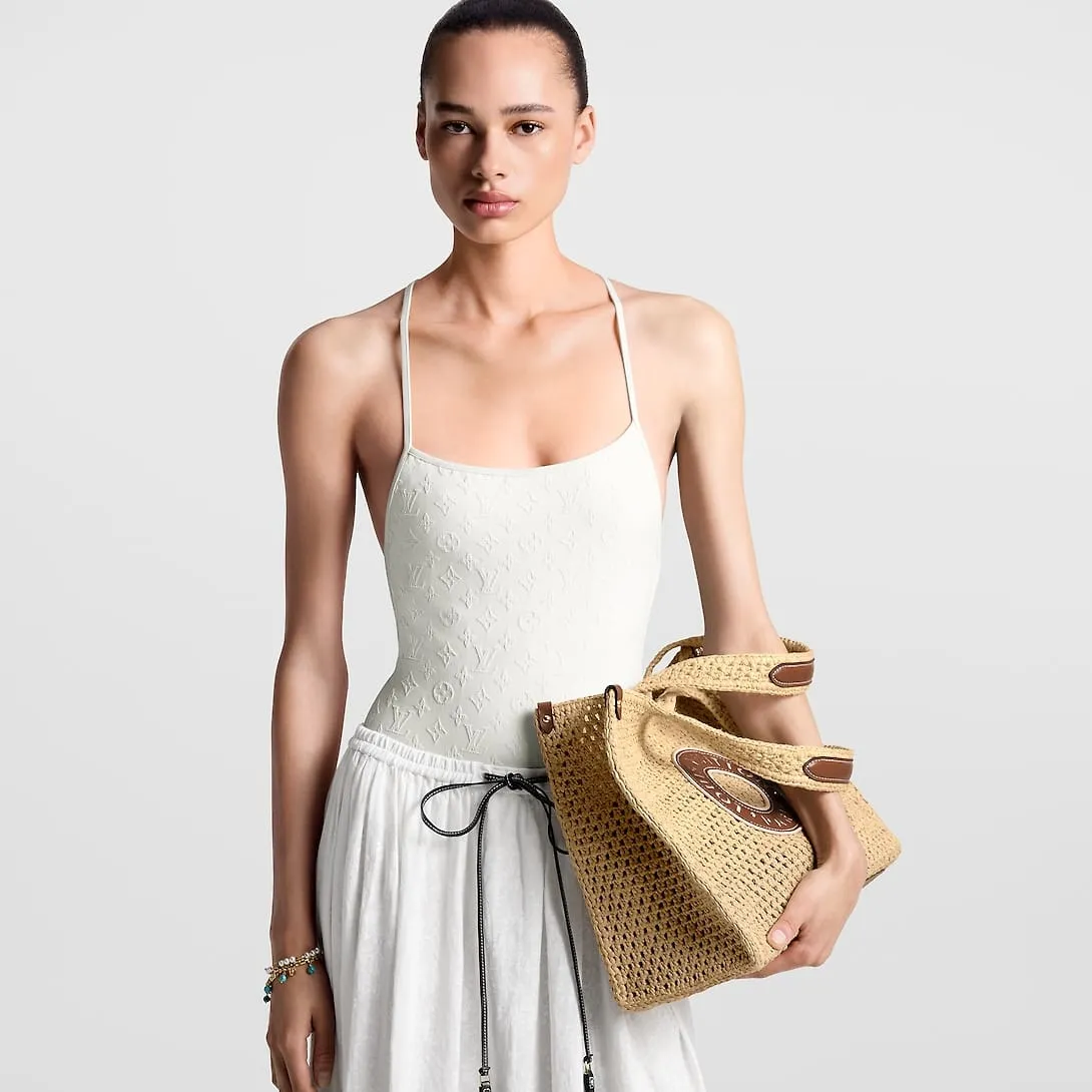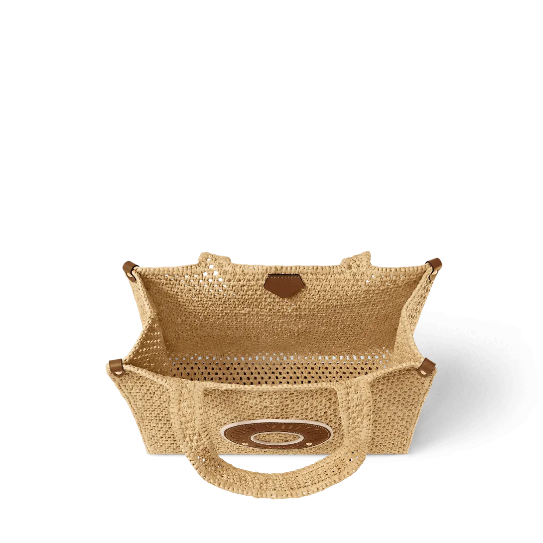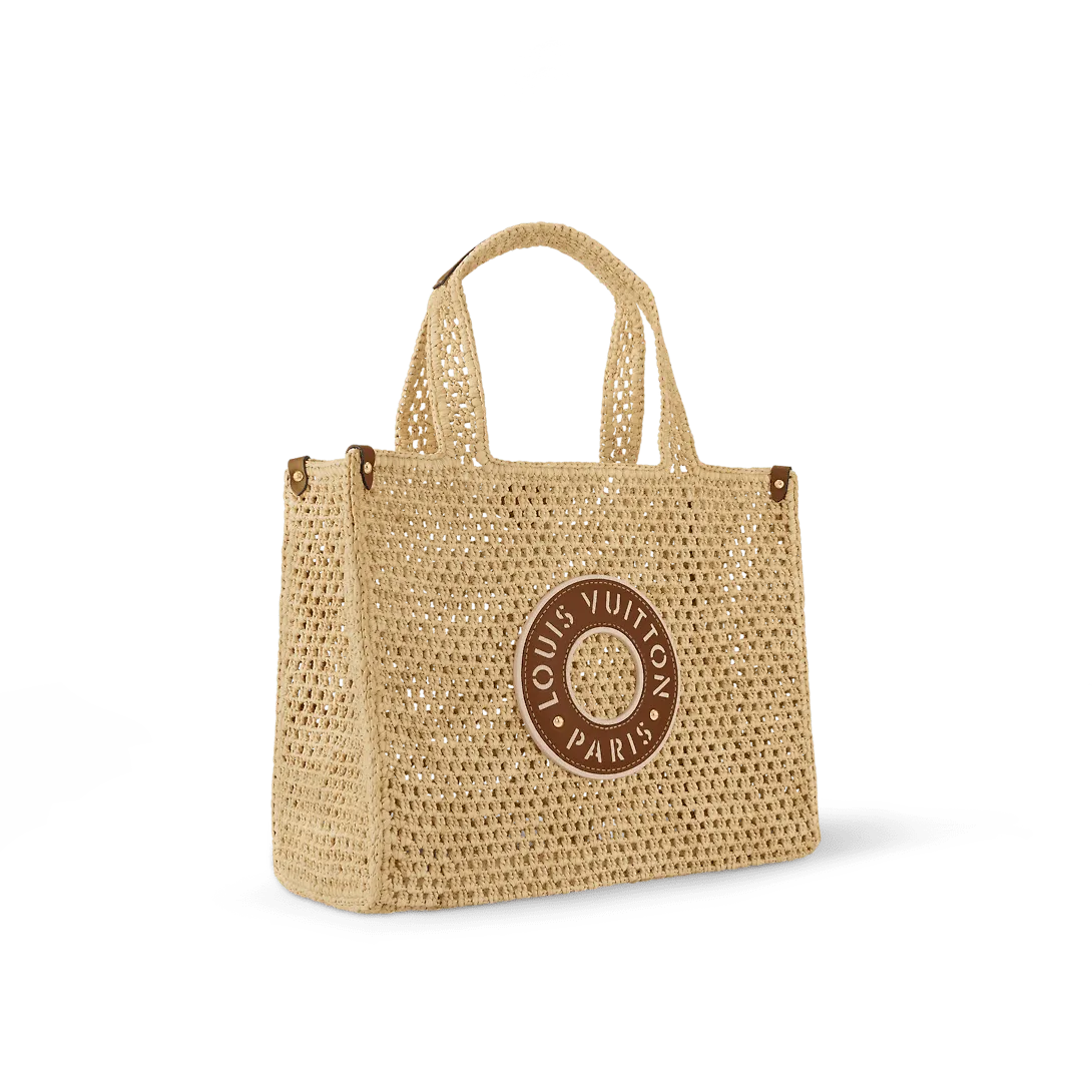 As part of the LV By The Pool Collection the OnTheGo MM tote is made from hand-crocheted 100% natural raffia. The riveted corners are in cowhide leather as is the circular “Louis Vuitton Paris” patch on the front. The OnTheGo MM can fit 13-inch laptop and a beach towel as well other essentials.