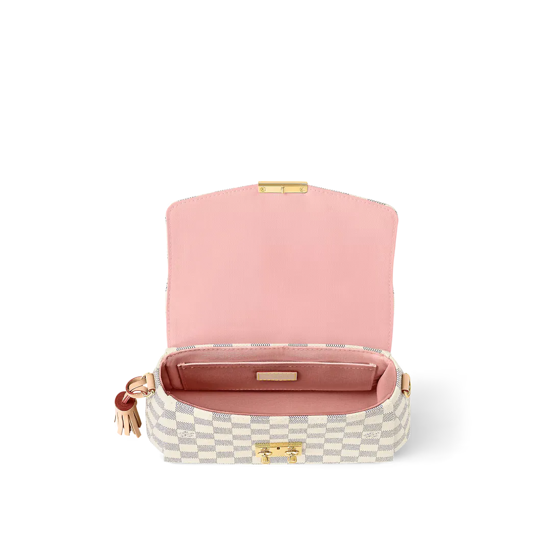 A compact bag with modern lines the Croisette in summery Damier Azur canvas boasts sophisticated details (note the signature S-lock) and a casual-chic allure. The removable leather tassel adds a touch of fun. Sized to fit the essentials plus a long wallet this versatile piece can be hand-carried slung over the shoulder or worn cross-body.