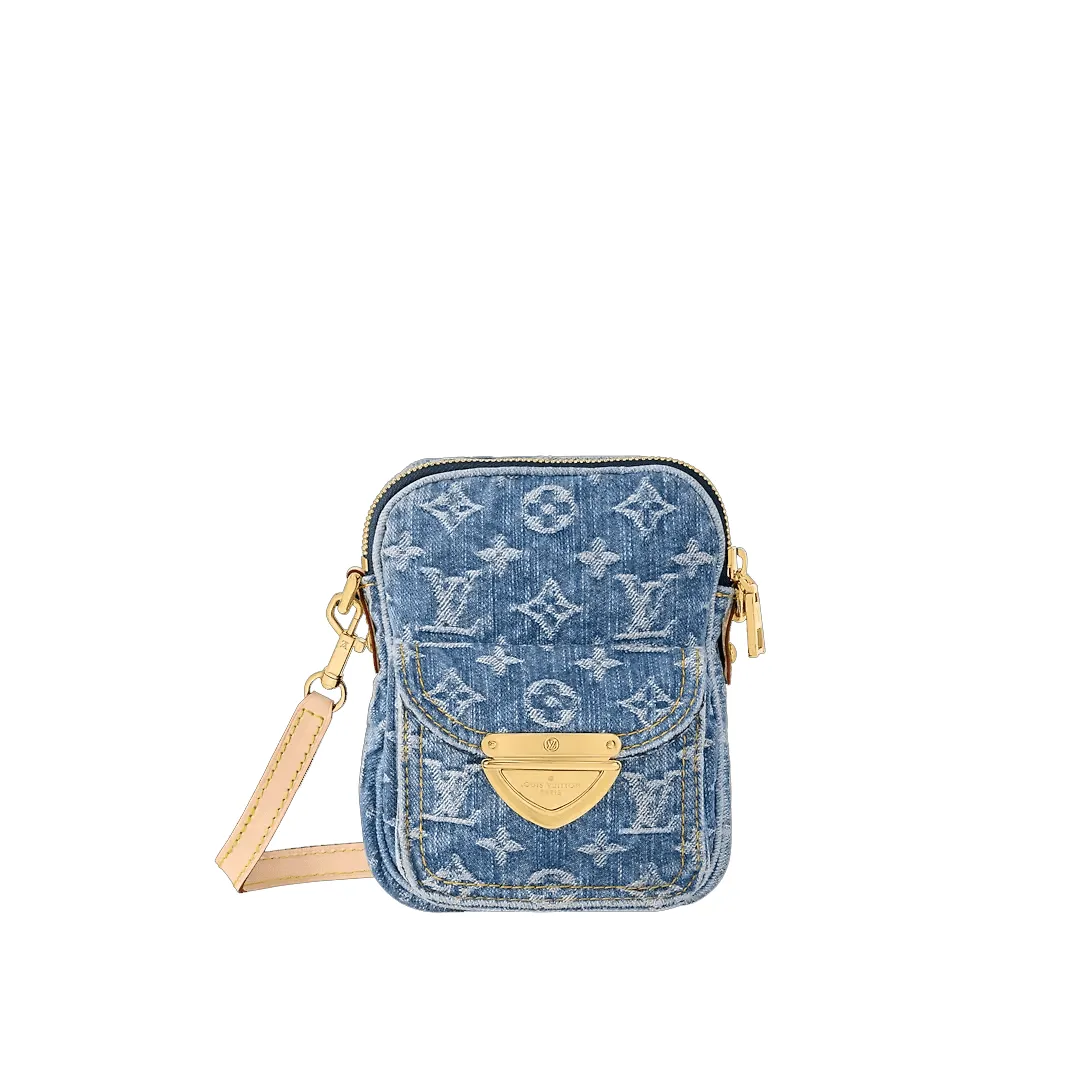 The Fairfax Pochette is made from stone-washed Monogram Denim and features a removable natural-leather shoulder strap. In addition to the main zippered compartment there’s a small pocket on the front that closes with the House’s eye-catching tuck lock. The Fairfax Pochette has just enough room for an iPhone a card holder lipstick and keys.