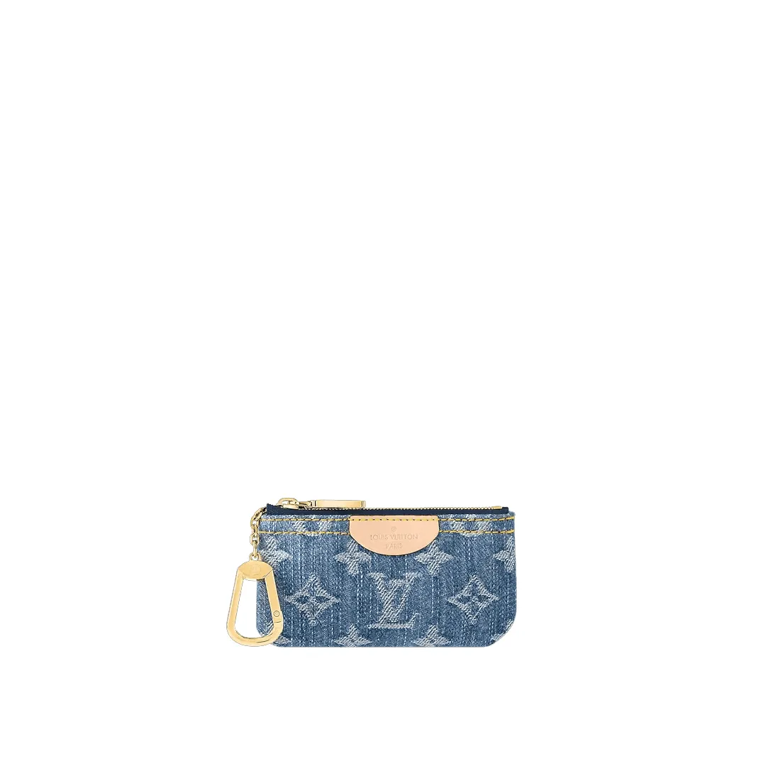 The Key Pouch is made from stone-washed Monogram Denim with natural cowhide-leather trim and gold-color hardware. In addition to holding keys it can also be used to securely carry cash and cards thanks to its zip closure. A small hook-and-chain allows it to be attached to a bag or belt.