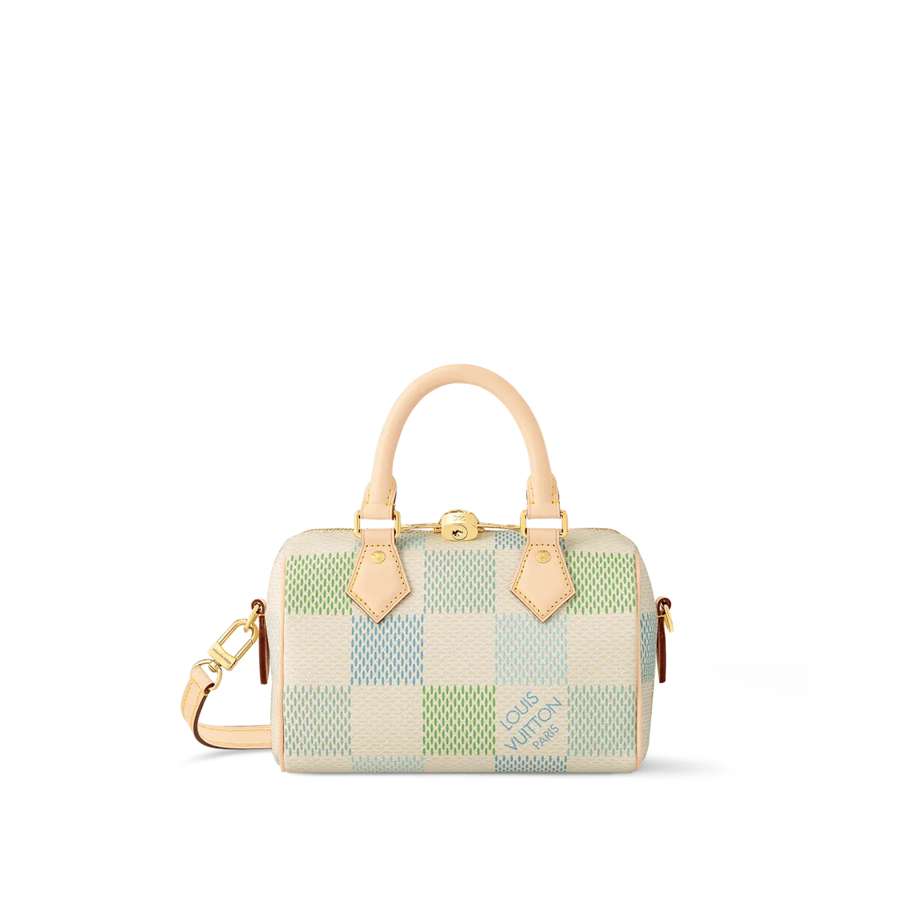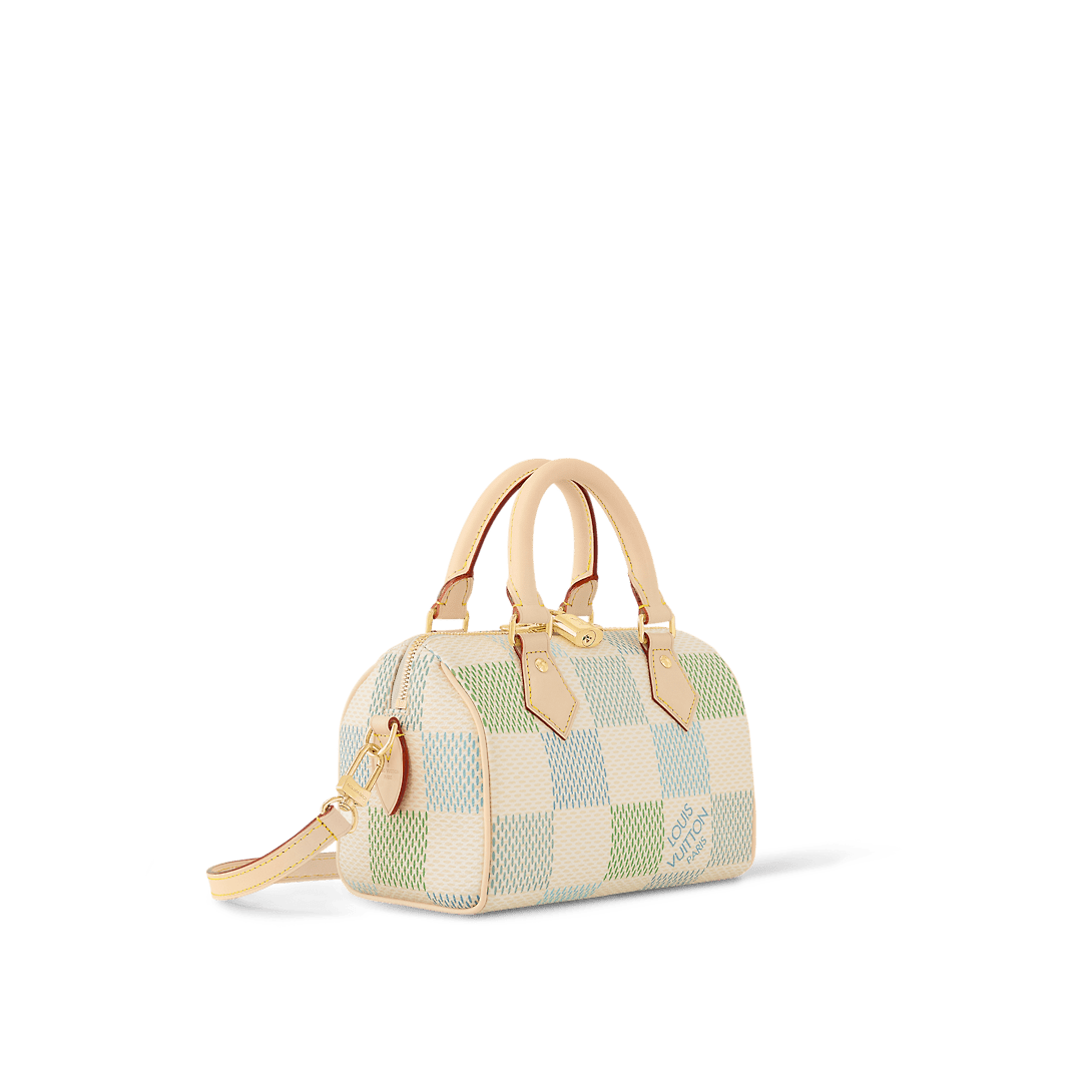 This Speedy Bandoulière 20 handbag is made from Damier Giant canvas in a fresh colorway that combines four different pastel shades thanks to a precise digital printing technique. Inspired by the House’s classic travel bag the distinctive shape has two rolled-leather top handles and a detachable and adjustable strap for shoulder and cross-body wear.