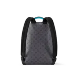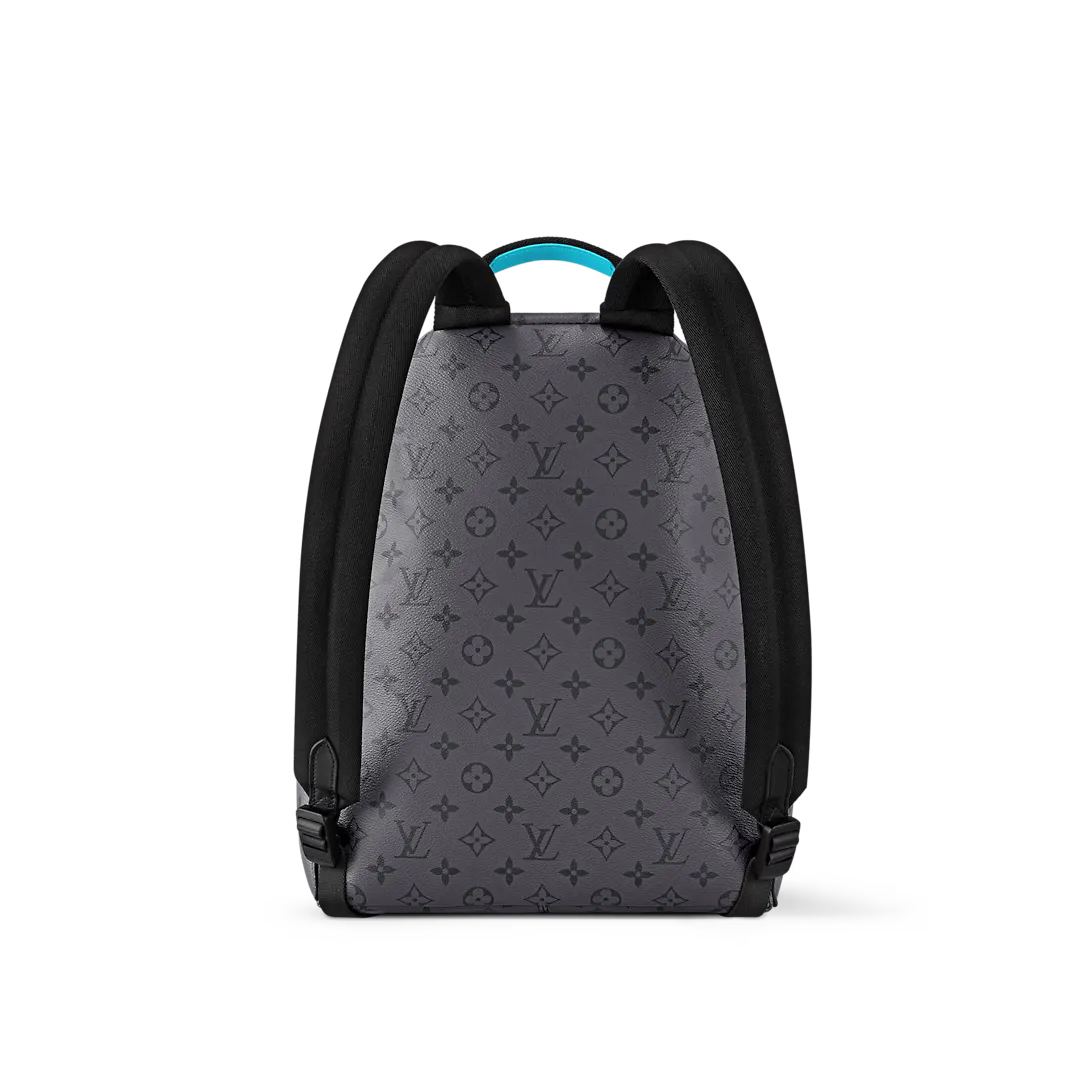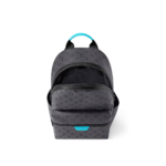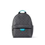 The Discovery Backpack PM is made from Monogram Eclipse Reverse canvas with its black-and-gray Monogram. The motif is livened up with turquoise on the leather label on the front pocket around the zipper and on the top handle. Its zipped front pocket and two open side pockets make this is a great everyday bag.