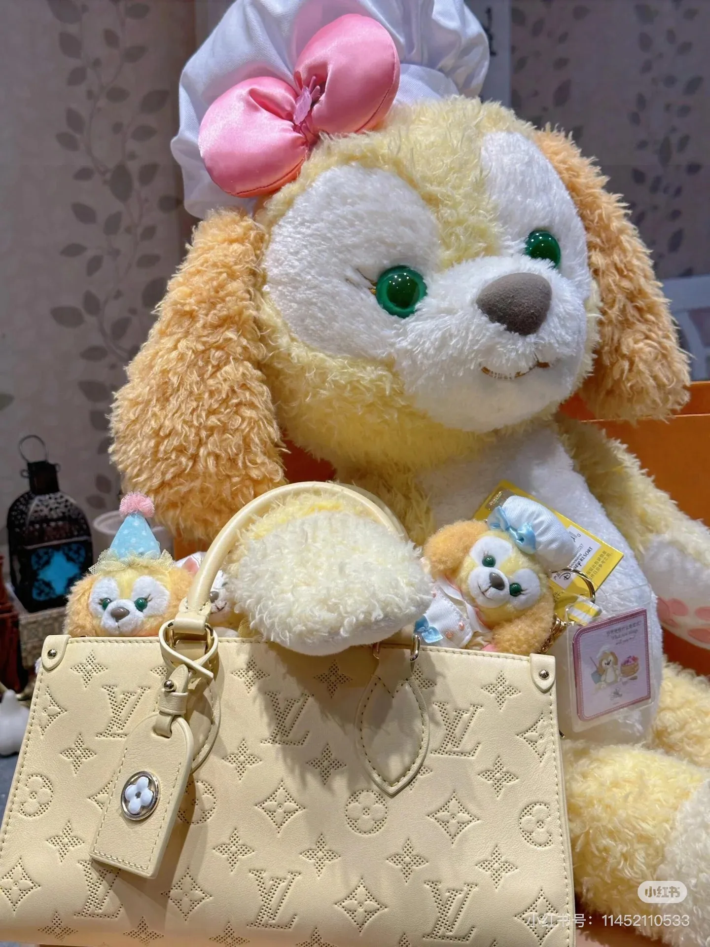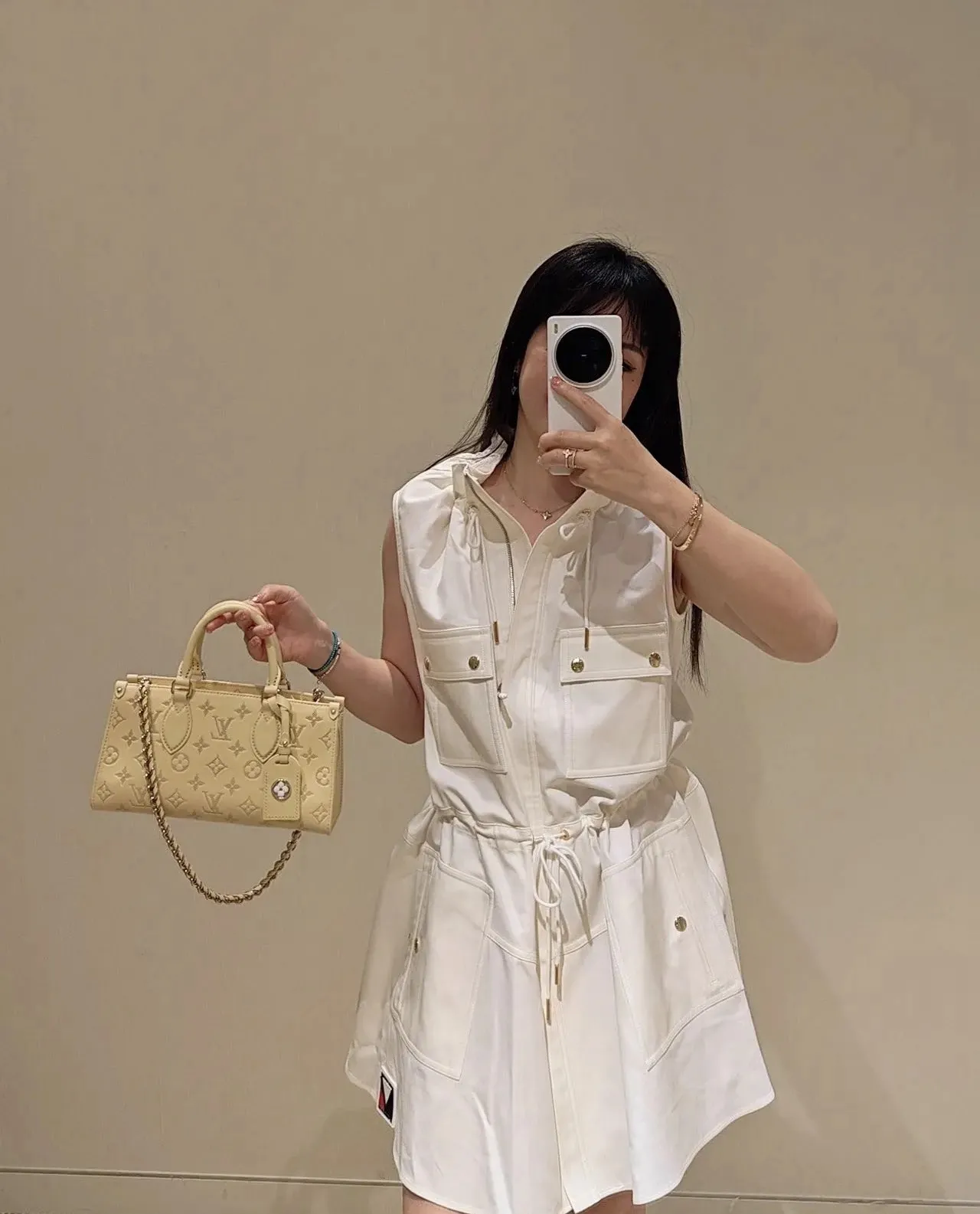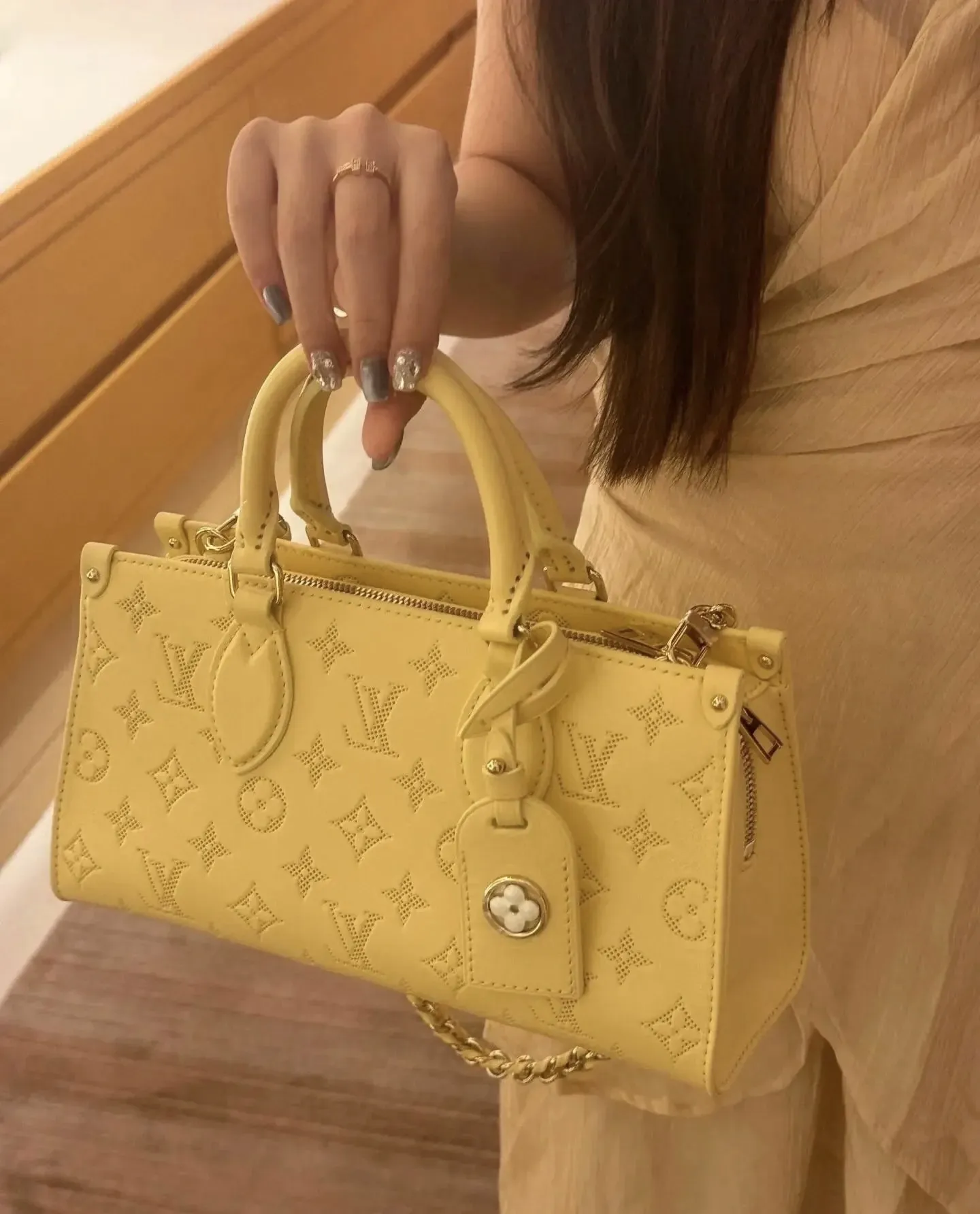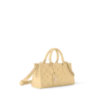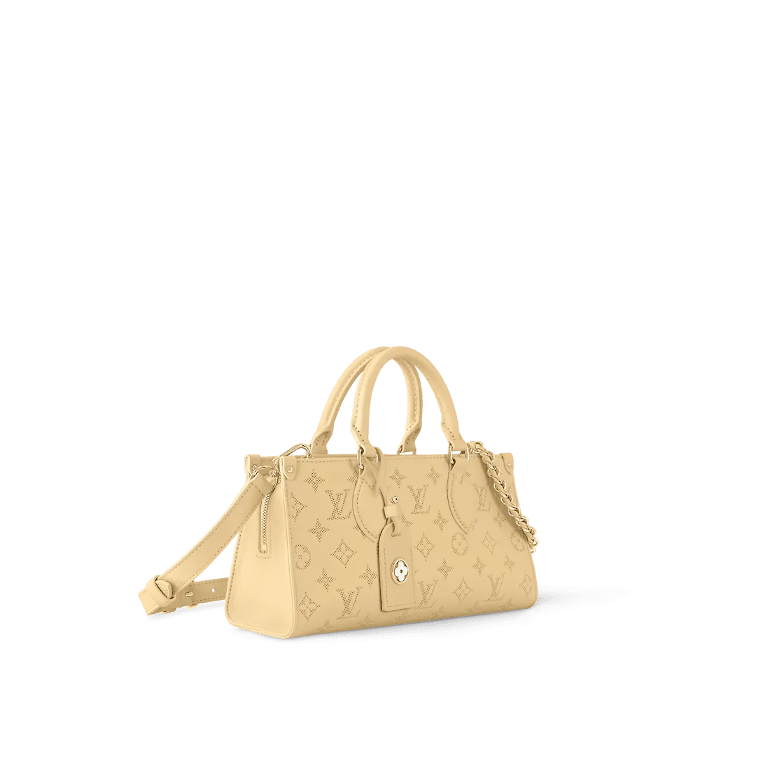 The elegantly elongated silhouette exquisite calf leather and subtle pale-yellow colorway all come together to make this OnTheGo East West bag truly eye-catching. It’s signed with a Monogram Flower name tag attached to the handle. Two articulated top handles and a removable chain-and-leather strap give carry options.
