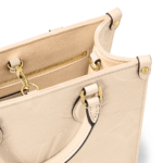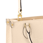A soft cream-tone makes the Monogram Empreinte leather of this OnTheGo PM bag seem luminous. The LVs and Monogram Flowers embossed into the leather are perfectly complemented by the rectangular lines of this small tote. It can hold smaller essentials like an iPad Mini. Two rolled-leather top handles and a detachable strap give carry options.
