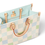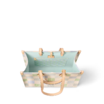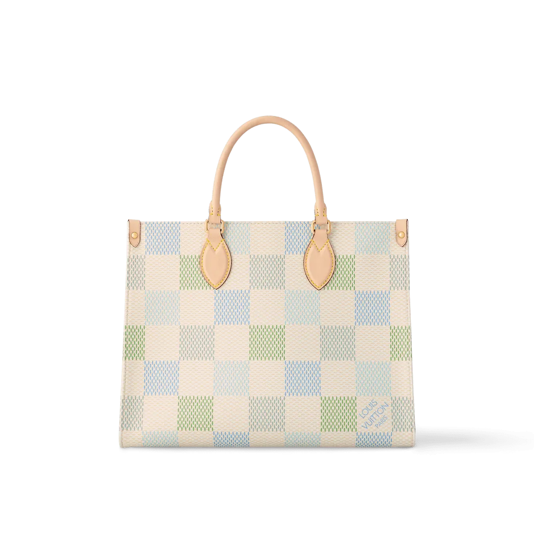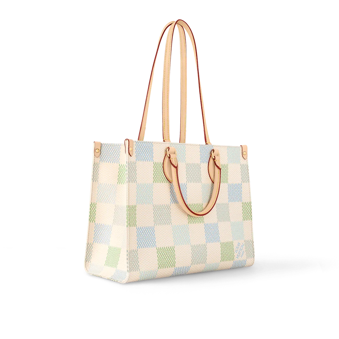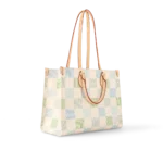 The OnTheGo MM tote bag is made from Damier Giant canvas in a charming colorway that combines four different pastel shades. In addition to two top handles in natural leather there are two longer straps mounted inside the bag for shoulder carry. Large enough for a 13-inch laptop this is a practical everyday bag.