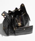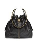 This Chanel Medium 25 Hobo Bag is in black caviar leather with antique gold hardware, features signature diamond quilt, two exterior side pockets, drawstring closure, a removable pouch, and a single interwoven brushed gold and Black leather shoulder strap.