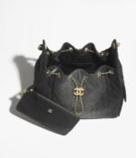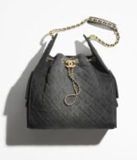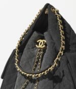 This Chanel Medium 25 Hobo Bag is crafted from black washed denim with antique gold hardware and features signature diamond quilting, two exterior pockets, drawstring closure, removable pouch, and interwoven brushed gold and white leather shoulder straps.