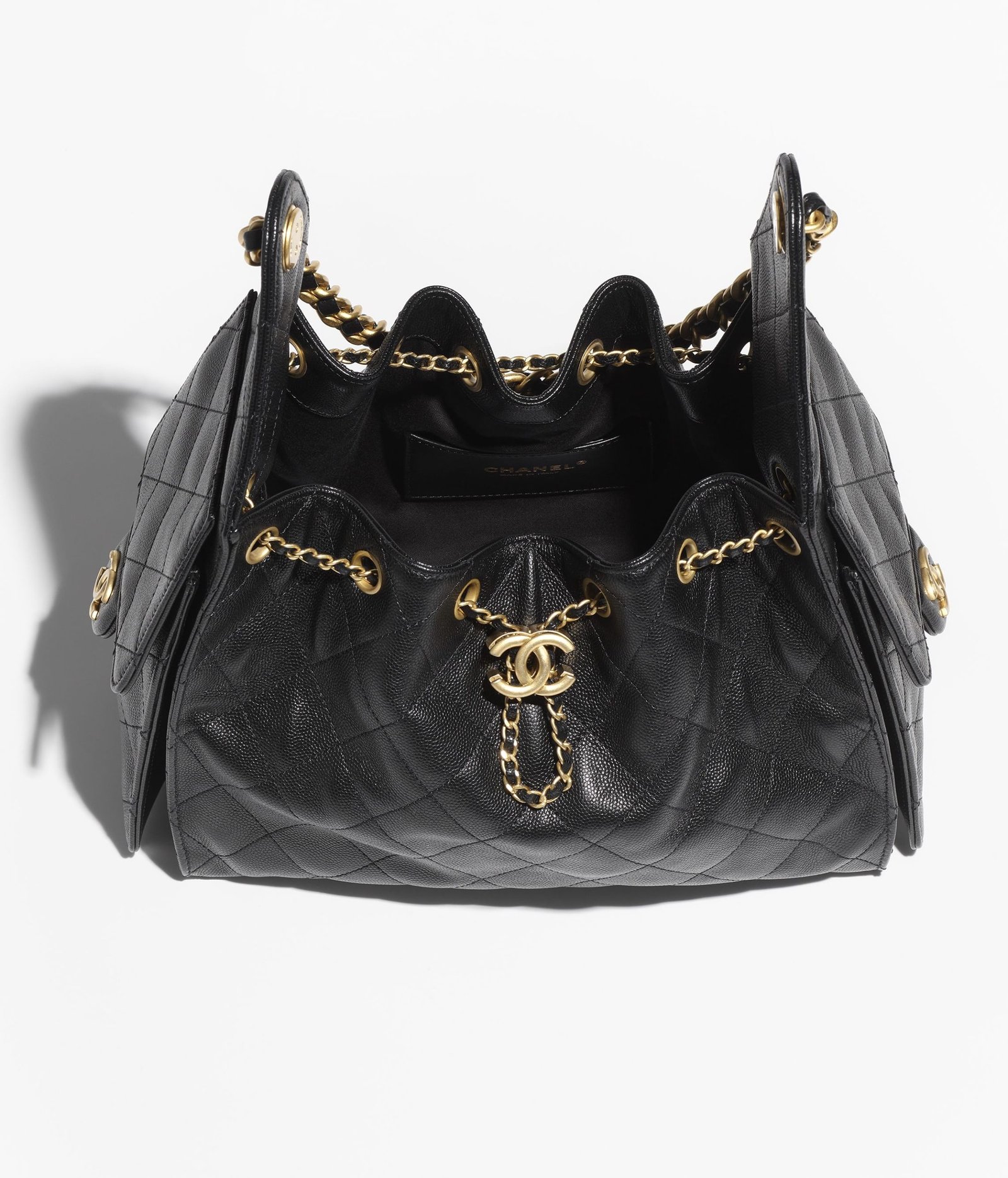 This Chanel Small 25 Hobo Bag is in black caviar leather with antique gold hardware, features signature diamond quilt, two exterior side pockets, drawstring closure, and a single interwoven antique gold and black leather shoulder strap.
