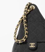 The Chanel Small 25 Hobo Bag is crafted from black washed denim with antique gold hardware and features signature diamond quilting, two exterior pockets, a drawstring closure, and an interwoven antique gold and black leather shoulder strap.