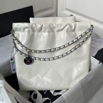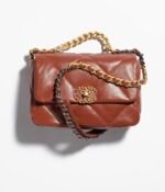 The Medium 19 Flap Bag is crafted in caramel lambskin with mixed metal hardware and features signature diamond quilting, signature CC interlocking clasp, exterior back pocket, chain top handle and long mixed metal and caramel leather chain