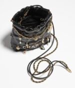 The Mini 22 Hobo is crafted from black calfskin leather with gold-tone hardware, featuring signature diamond quilting, jeweled charms and gold-tone metal ‘Chanel’ signature on the front of the bag, CHANEL Paris metal hangtag, interwoven chain links with gold-tone metal and black leather shoulder straps.