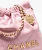 This mini 22 Hobo bag is made of pink calfskin with gold-tone hardware and features signature diamond quilting, gold-tone metal CHANEL lettering on the front, and a long chain interwoven with gold and pink leather.