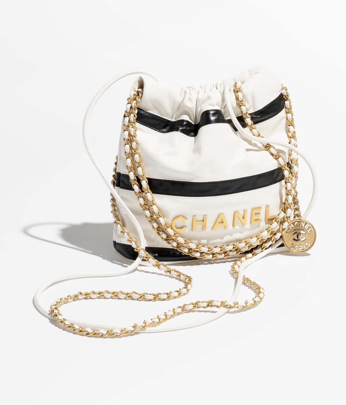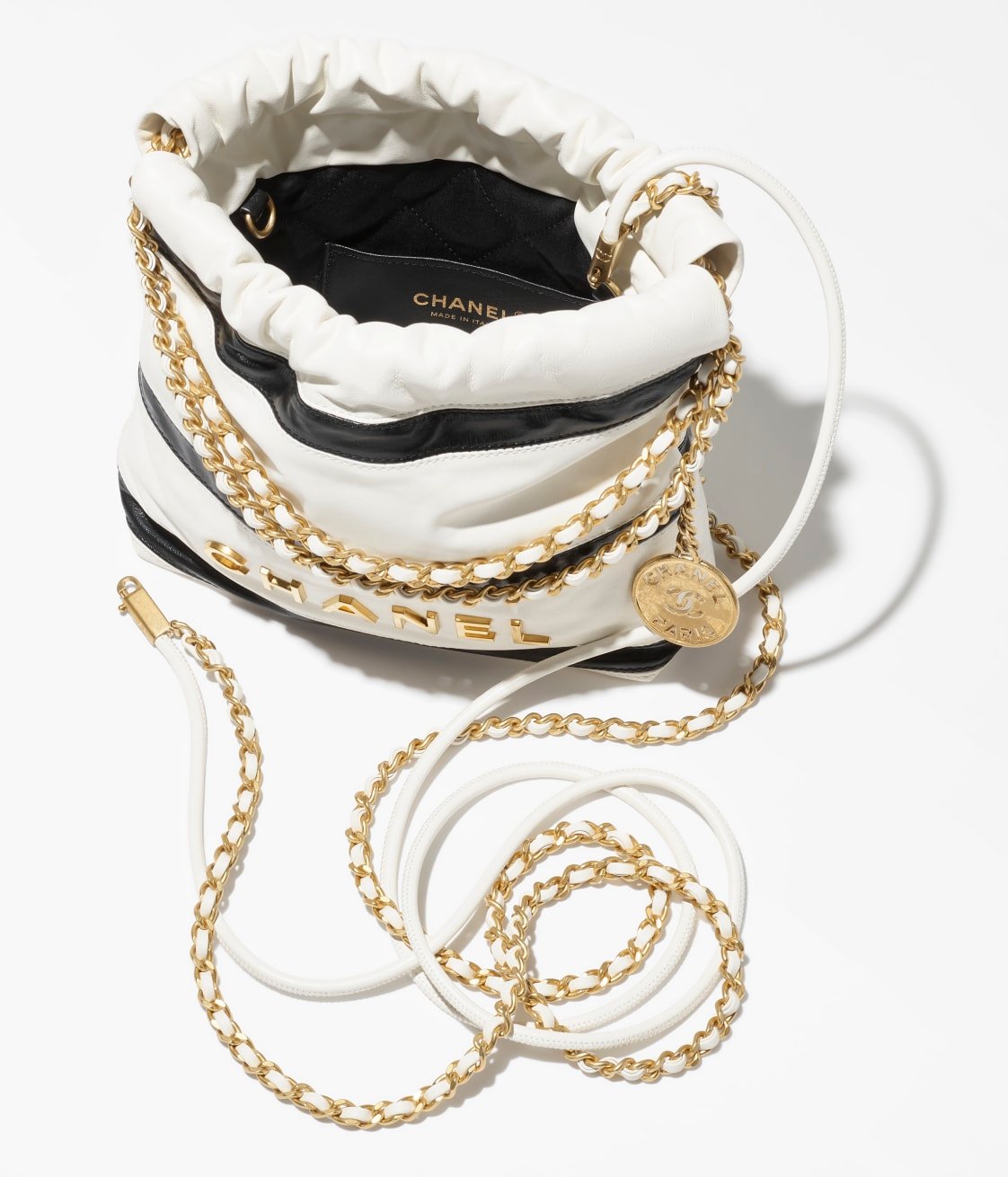 This mini 22 Hobo bag is crafted from black and white calfskin with gold-tone hardware and features signature diamond quilting, gold-tone metal CHANEL lettering on the front, and a long chain interwoven with gold and white leather.