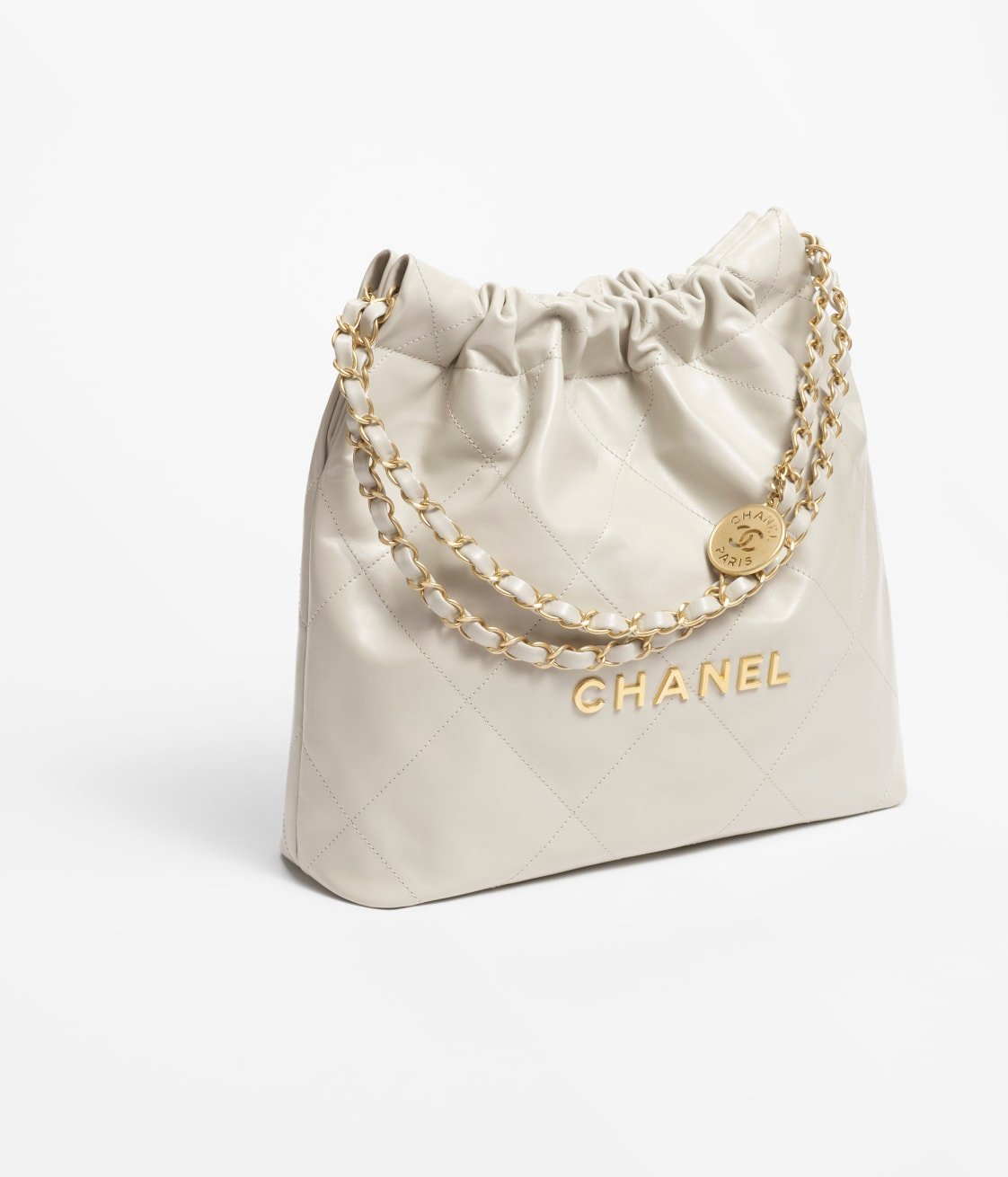 The Small 22 Hobo Bag is crafted in beige calfskin with antique gold hardware and features the signature diamond quilting, antique gold metal front with a removable pouch and a long antique gold and beige leather chain.