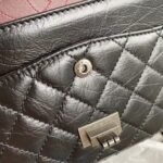 The medium Reissue 2.55 flap bag is made of black distressed calfskin leather with ruthenium hardware, double flap, tonal stitching, Mademoiselle turnlock, half-moon back pocket and Reissue chain