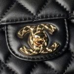 This mini flap bag features a metal top handle and is crafted in black lambskin with gold-tone hardware, front flap with CC turnlock closure, half-moon back pocket, top handle and single interwoven antique gold-tone chain link and black leather shoulder/crossbody strap.