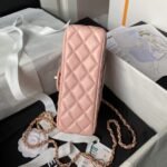 This mini flap bag features a metal top handle, crafted from pink lambskin with gold hardware, front flap with CC turnlock closure, half-moon back pocket, top handle and single interwoven antique gold chain link and pink leather shoulder/crossbody strap.