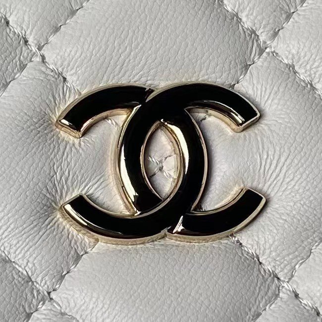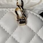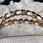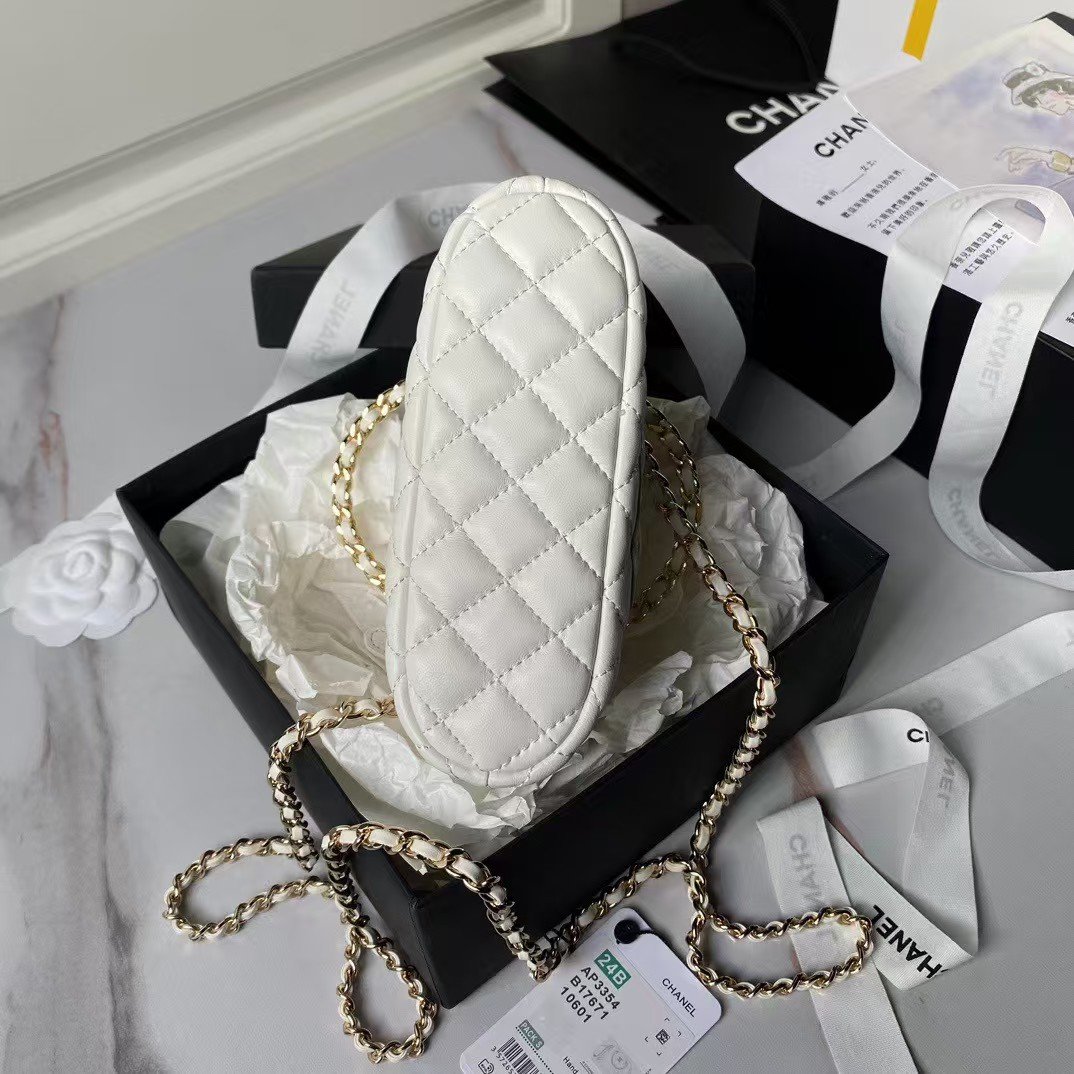 This Chanel Mini Chain Crossbody Bag is crafted from white calfskin leather with light gold hardware featuring signature diamond quilting, light gold CC logo on the front, zip closure, half-moon back pockets, and white leather and light gold chain shoulder/crossbody strap.