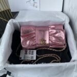 This Chanel Mini Bow Crossbody Bag is crafted in metallic pink shiny lambskin with light gold hardware, lambskin bow shape, signature CC logo with light gold hardware, buckle closure, pink leather and light gold chain interwoven shoulder/crossbody strap.