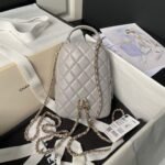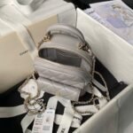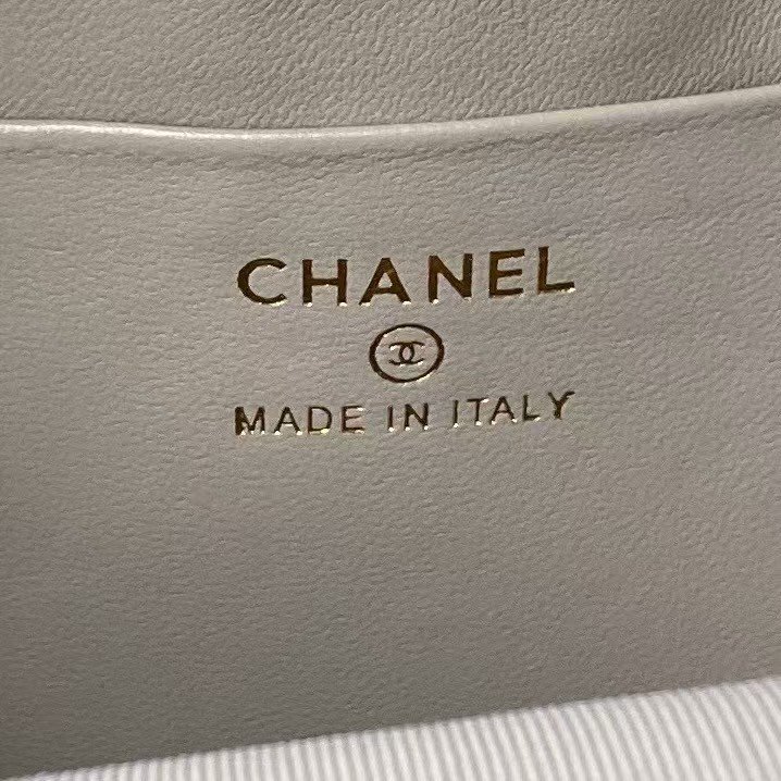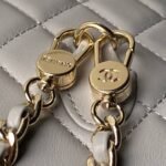 The Mini Phone Holder Backpack is crafted from grey lambskin with light gold hardware and features a backpack-style pocket, a small front snap coin pocket with CC logo, a leather top handle, a full zip closure with leather zipper and CC logo charm, and a convertible light gold chain intertwined with a grey leather crossbody/shoulder strap.