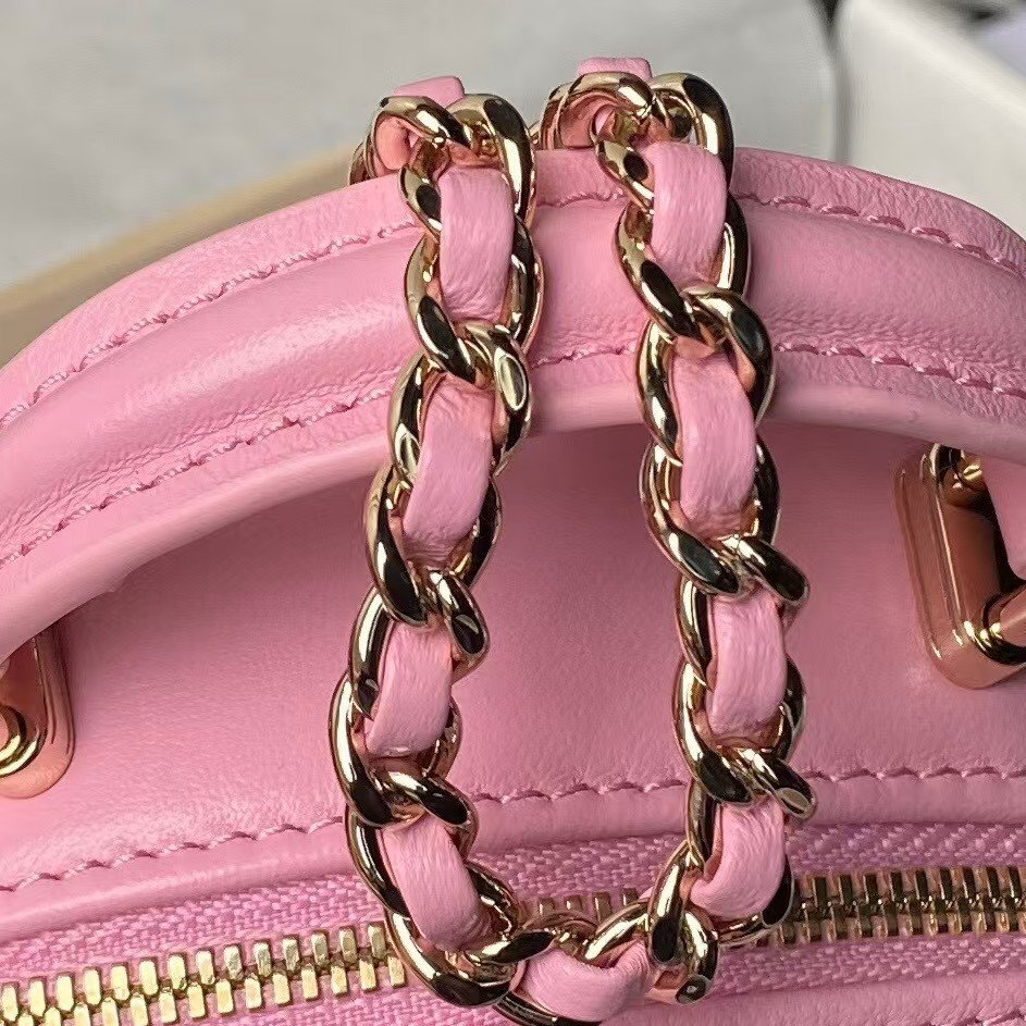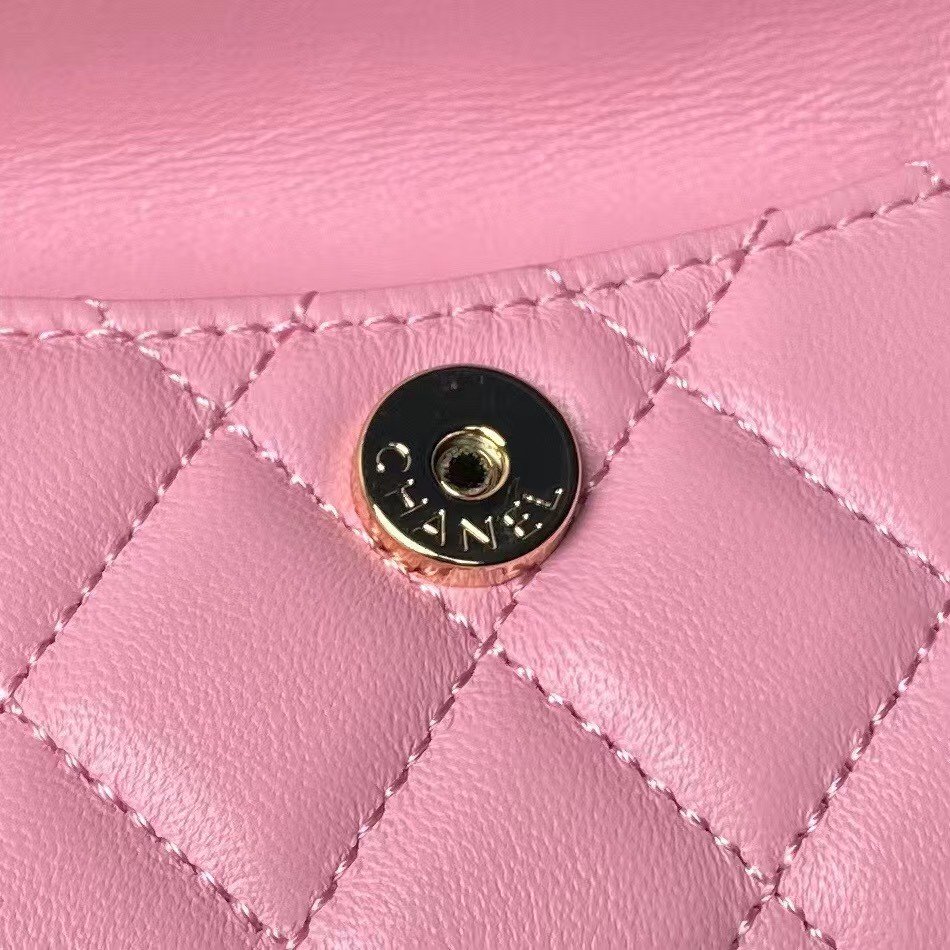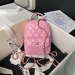 This Mini Phone Holder Backpack with Chain is crafted from pink lambskin leather with light gold hardware, and features a backpack-style bag, small front snap coin pocket with CC logo, leather top handles, full zip closure with leather zipper and CC logo charm, and a convertible light gold chain interwoven with a pink leather crossbody/shoulder strap.