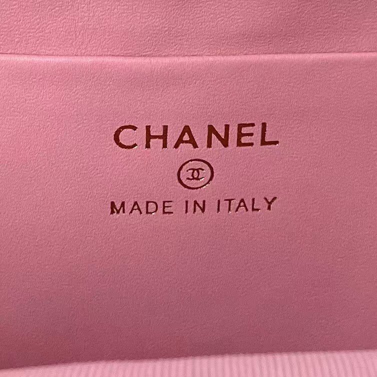 The interior is lined with pink grosgrain fabric with two interior card slots.