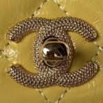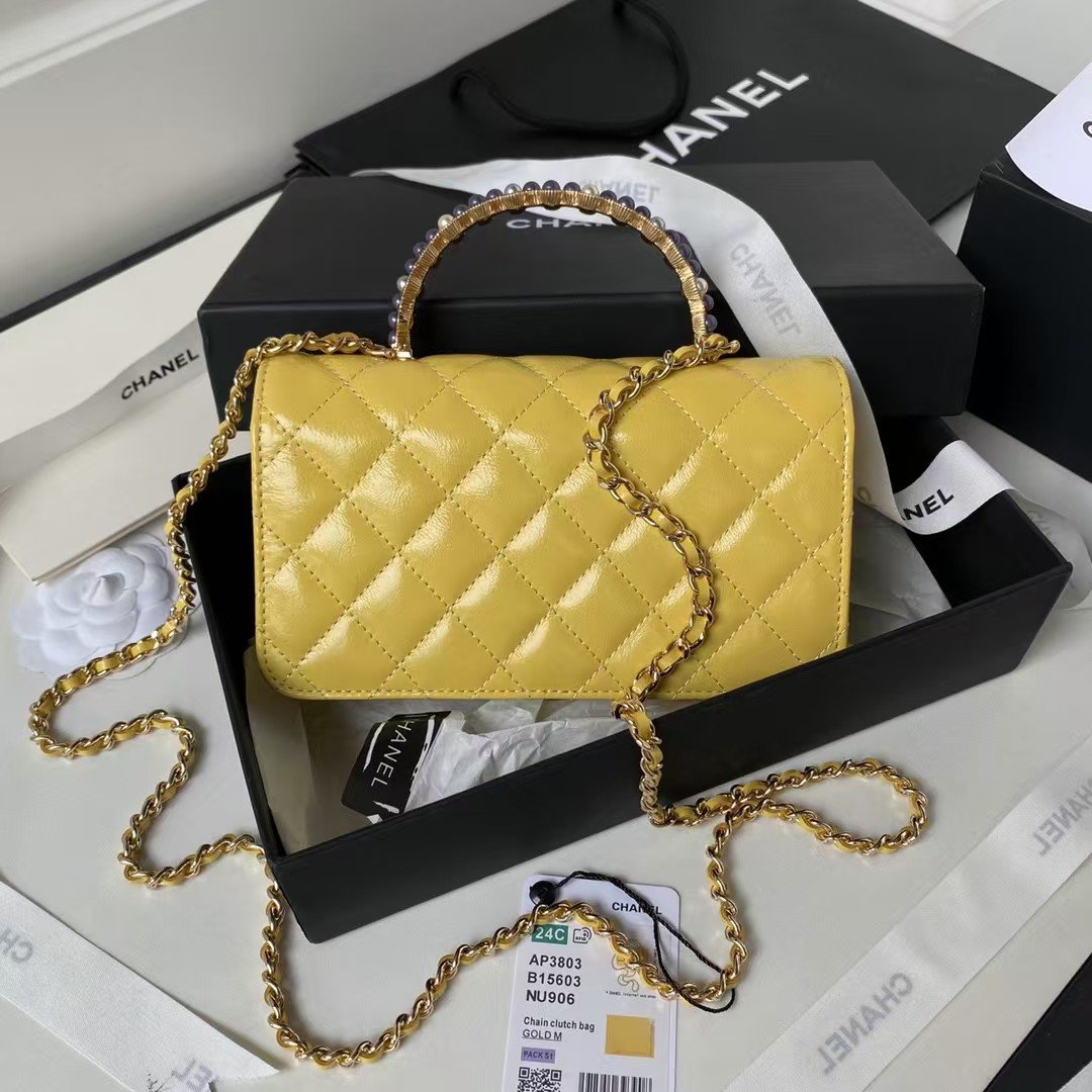 Chanel 24P AP3803 Shiny Crinkled Lambskin Chain Clutch Pearl Handle Yellow