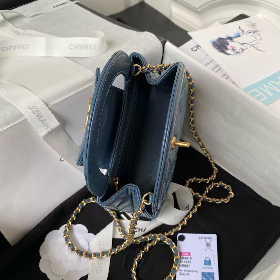 Chanel AS4416 Mini Shopping Bag Shiny Aged Calfskin Gold-Tone Metal Blue
