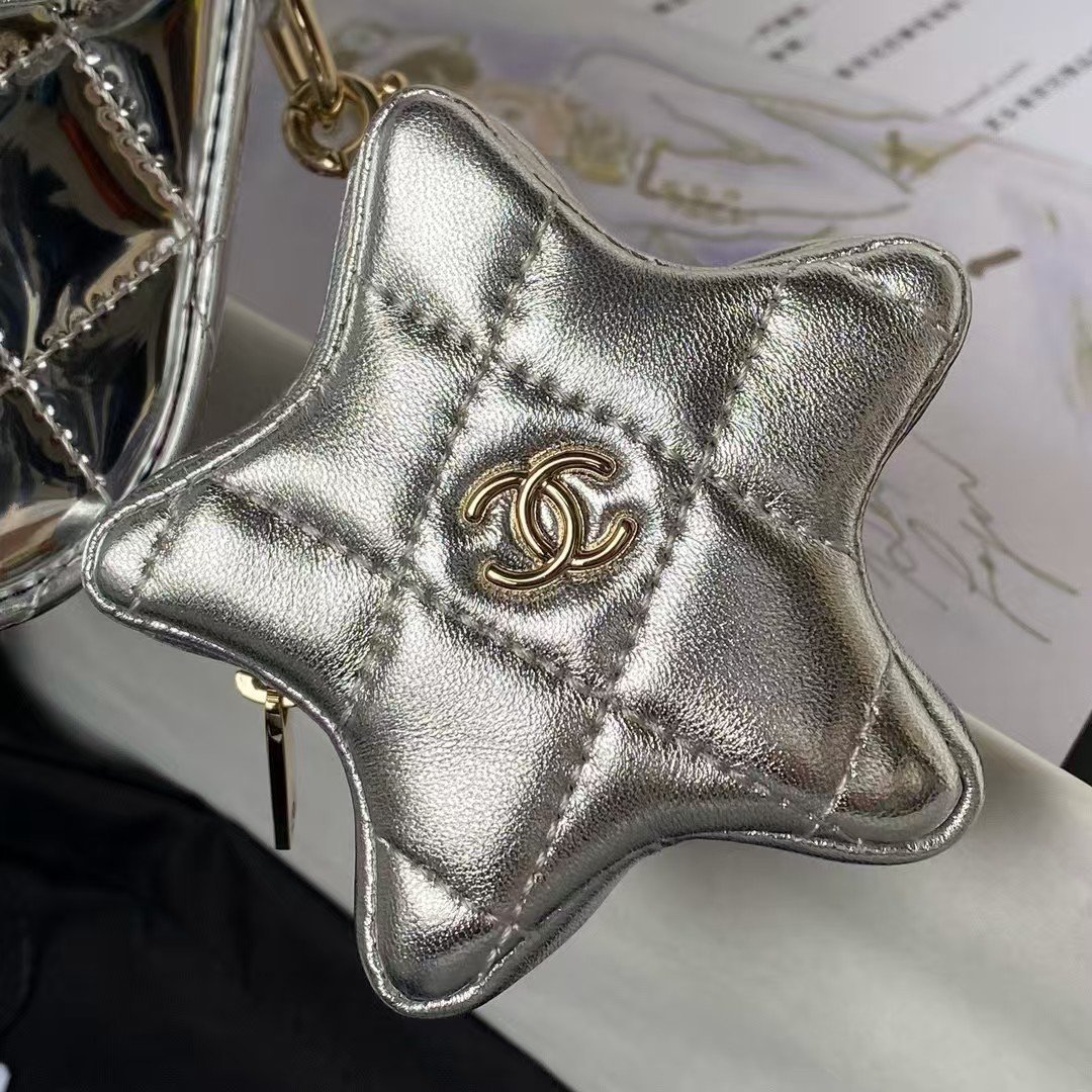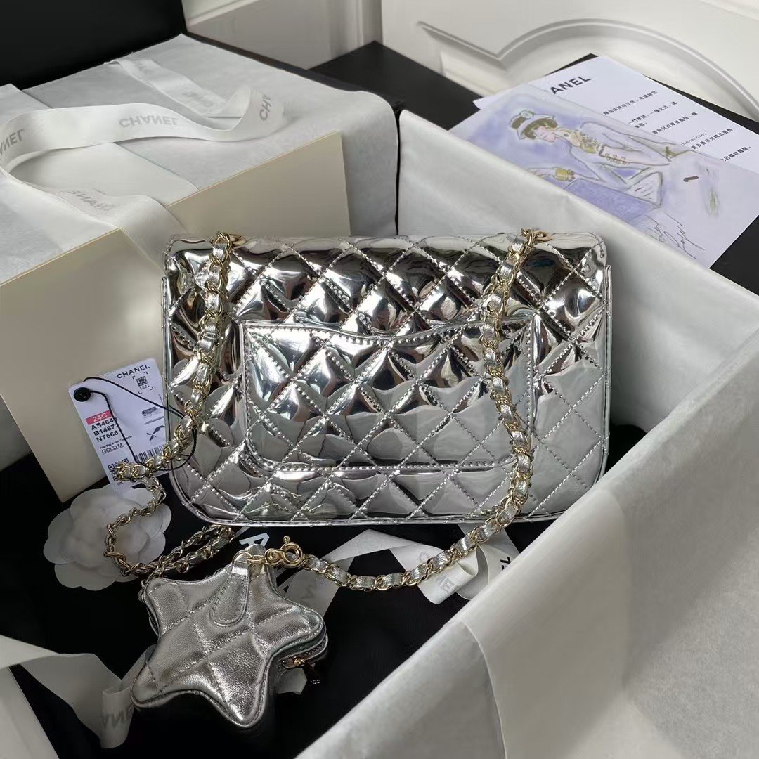 Chanel AS4648 Flap Bag Star Coin Purse Mirrored Calfskin Metallic Calfskin & Gold Metallic Silver