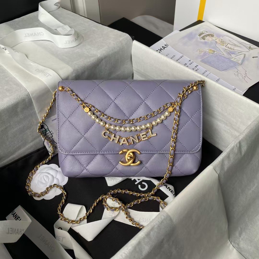 Chanel AS5011 Flap bag Shiny Lambskin Imitation Pearls & Gold-Tone Metal Light Purple