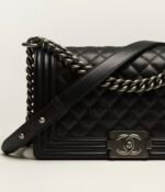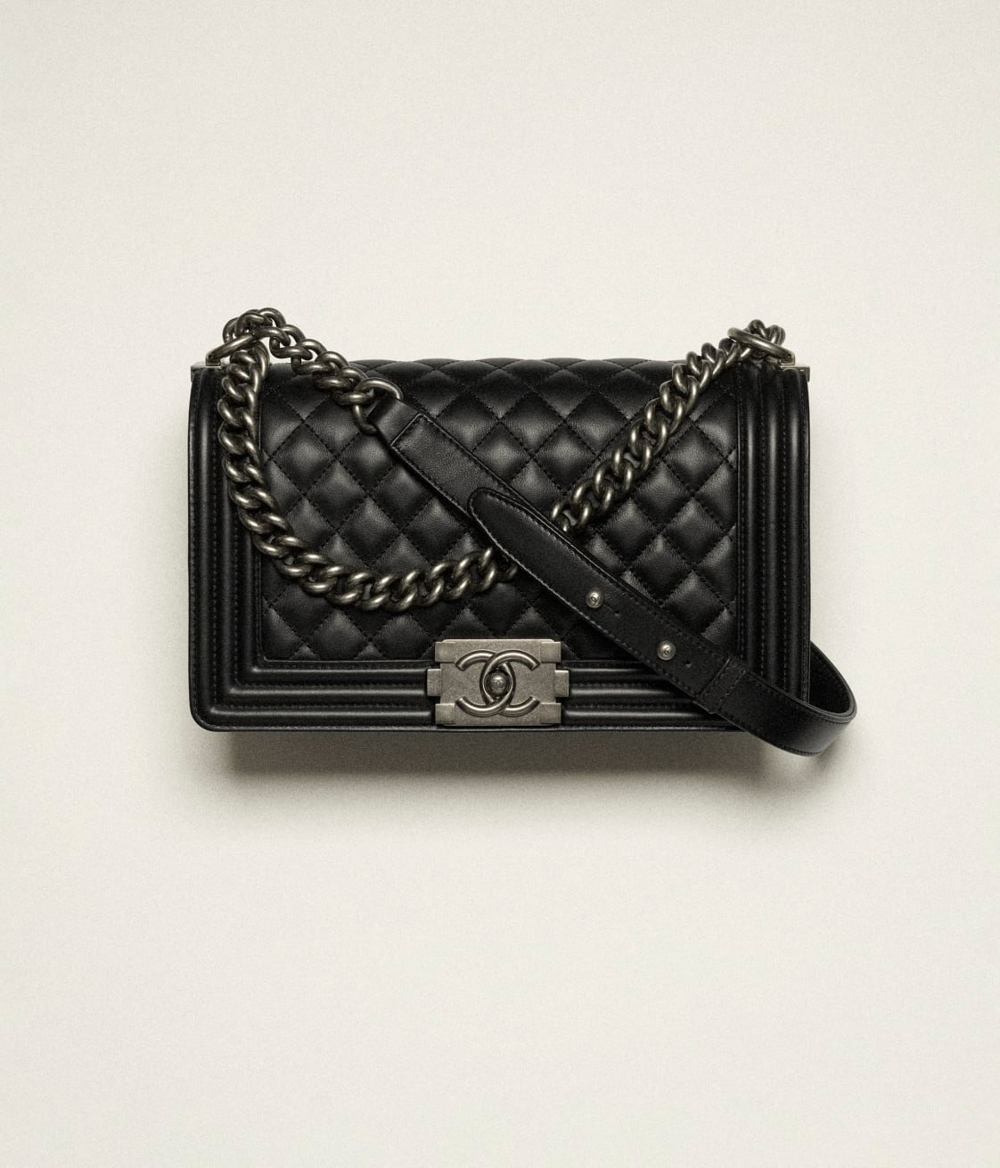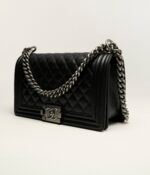 This Chanel Medium Boy Bag is crafted in black lambskin with ruthenium hardware and features a full front flap, Le Boy CC snaps and ruthenium-tone chain links, and a black leather padded shoulder/crossbody strap.