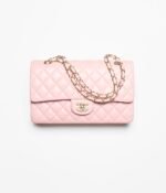 This flap bag is made of light pink lambskin with gold hardware, front flap with signature CC turnlock closure, half-moon back pocket, adjustable gold interwoven chain link and light pink leather shoulder strap.