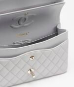 This flap bag is made of grey lambskin with gold hardware, front flap with signature CC turnlock closure, half-moon back pocket, adjustable gold interwoven chain link and grey leather shoulder strap.