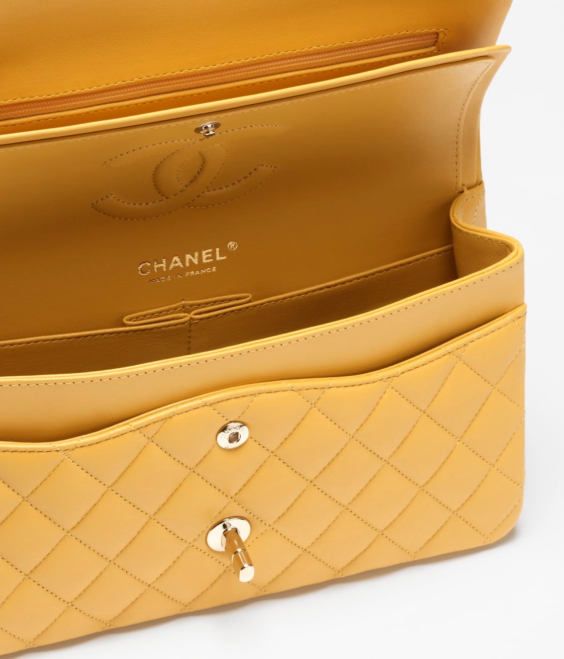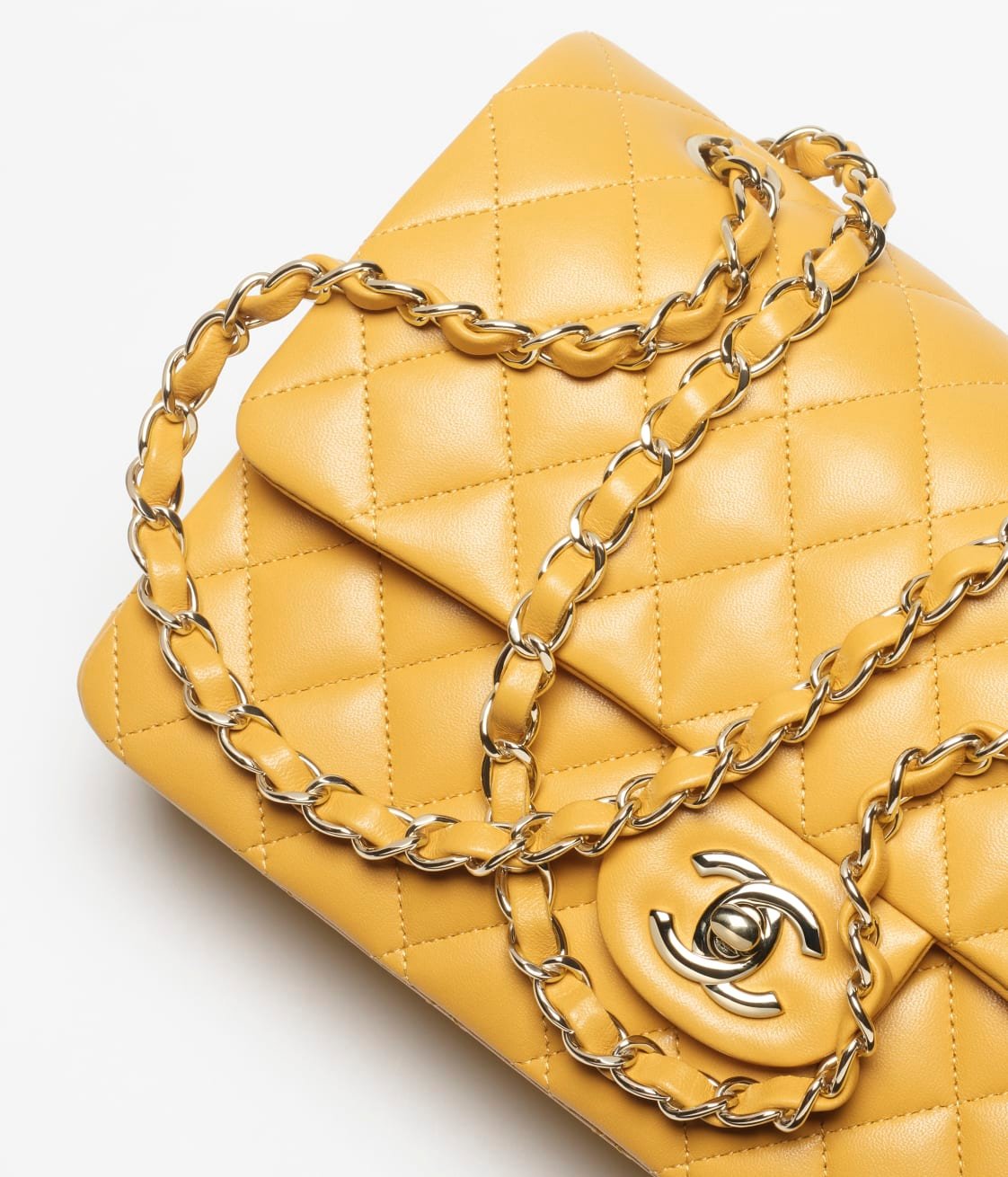 This flap bag is made of yellow lambskin with gold-tone hardware, front flap with signature CC turnlock closure, half-moon back pocket, adjustable gold-tone interwoven chain link and yellow leather shoulder strap.