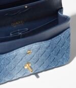 This Chanel classic flap bag is crafted in blue gradient denim with antique gold hardware, tonal stitching, front flap with CC turnlock closure, half-moon back pockets, and an antique gold chain and leather interwoven shoulder/crossbody strap.
