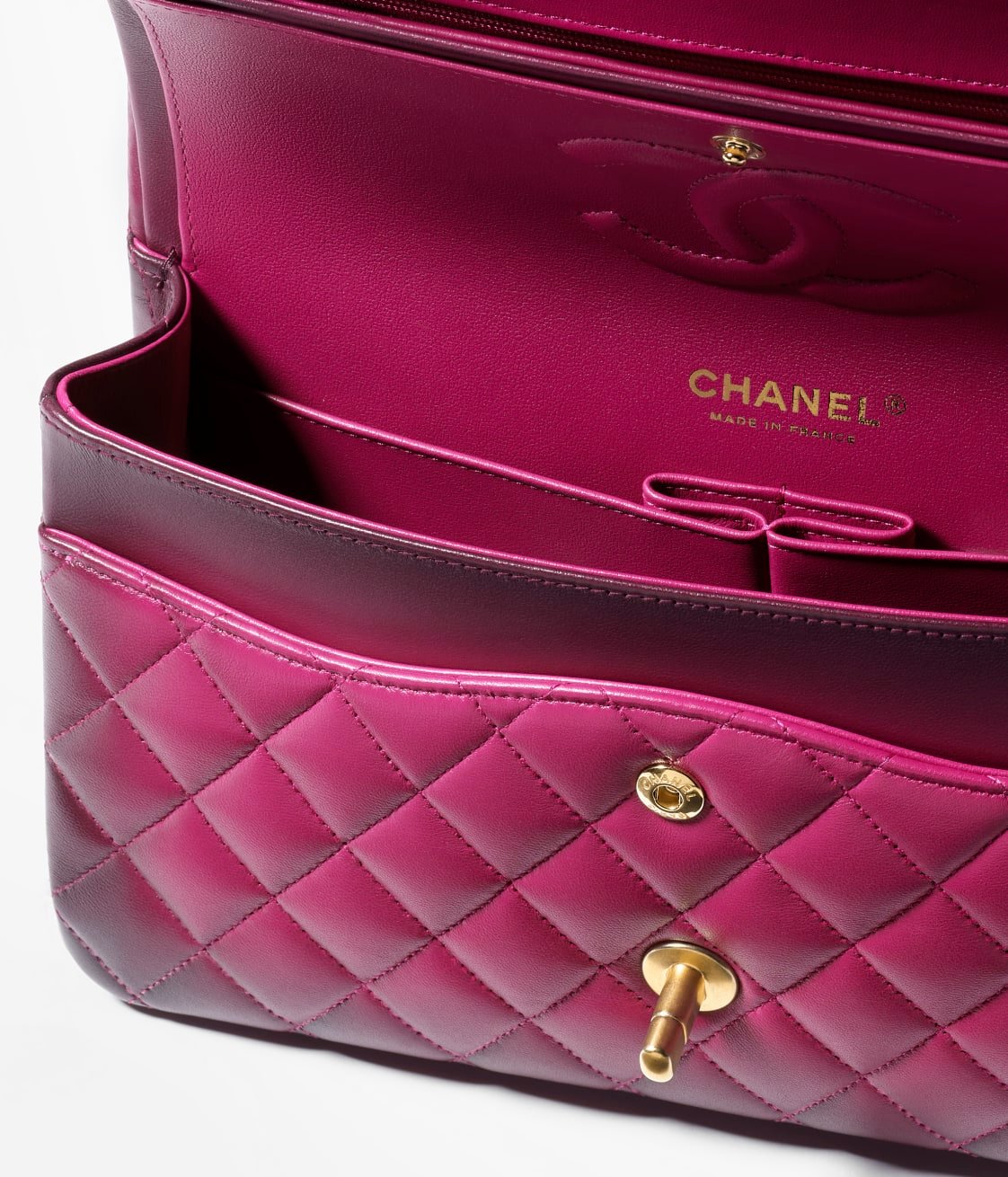 The interior is lined with fuchsia leather and features a zip pocket with logo zipper on the back wall and an open pocket on the back wall below the zip pocket.