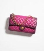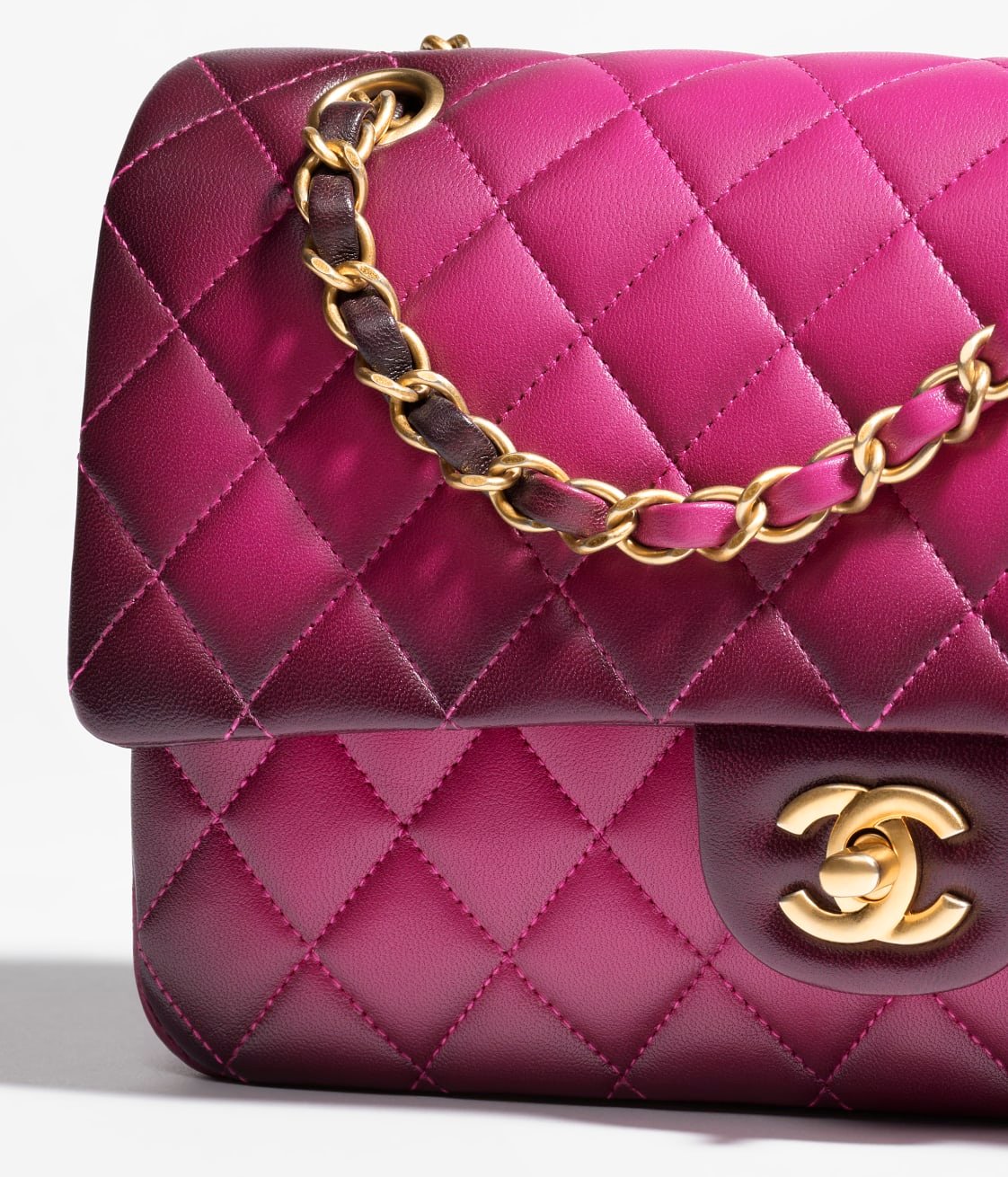 This flap bag is made of ombre lambskin with light gold hardware, front flap with CC turnlock closure, half-moon back pocket, interwoven light gold chain and ombre leather crossbody strap.