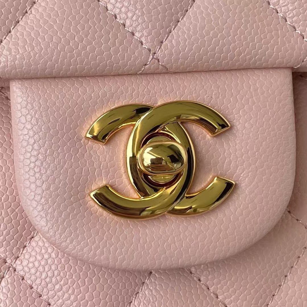 This medium classic double flap bag is crafted in pink caviar leather with light gold hardware, featuring the signature CC turnlock closure on the front flap, half-moon back pocket, adjustable interwoven light gold chain and pink leather shoulder strap.