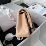 This medium classic double flap bag is crafted in light beige caviar leather with silver hardware, front flap with signature CC turnlock closure, half-moon back pocket, adjustable interwoven silver chain and light beige leather shoulder strap.