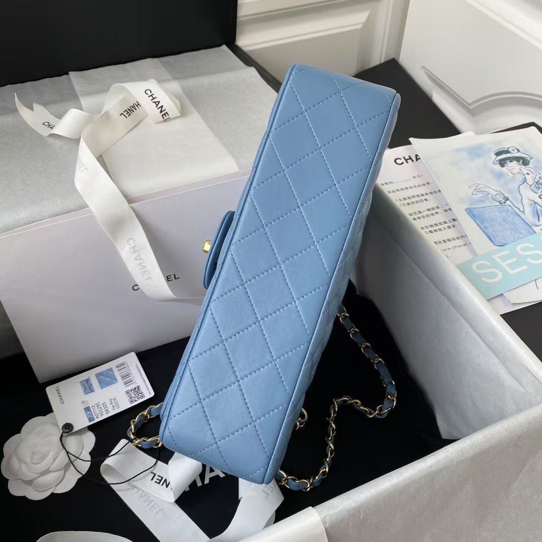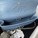 This medium classic double flap bag is crafted in blue lambskin with gold hardware, front flap with signature CC turnlock closure, half-moon back pocket, adjustable gold interwoven chain and blue leather shoulder strap.